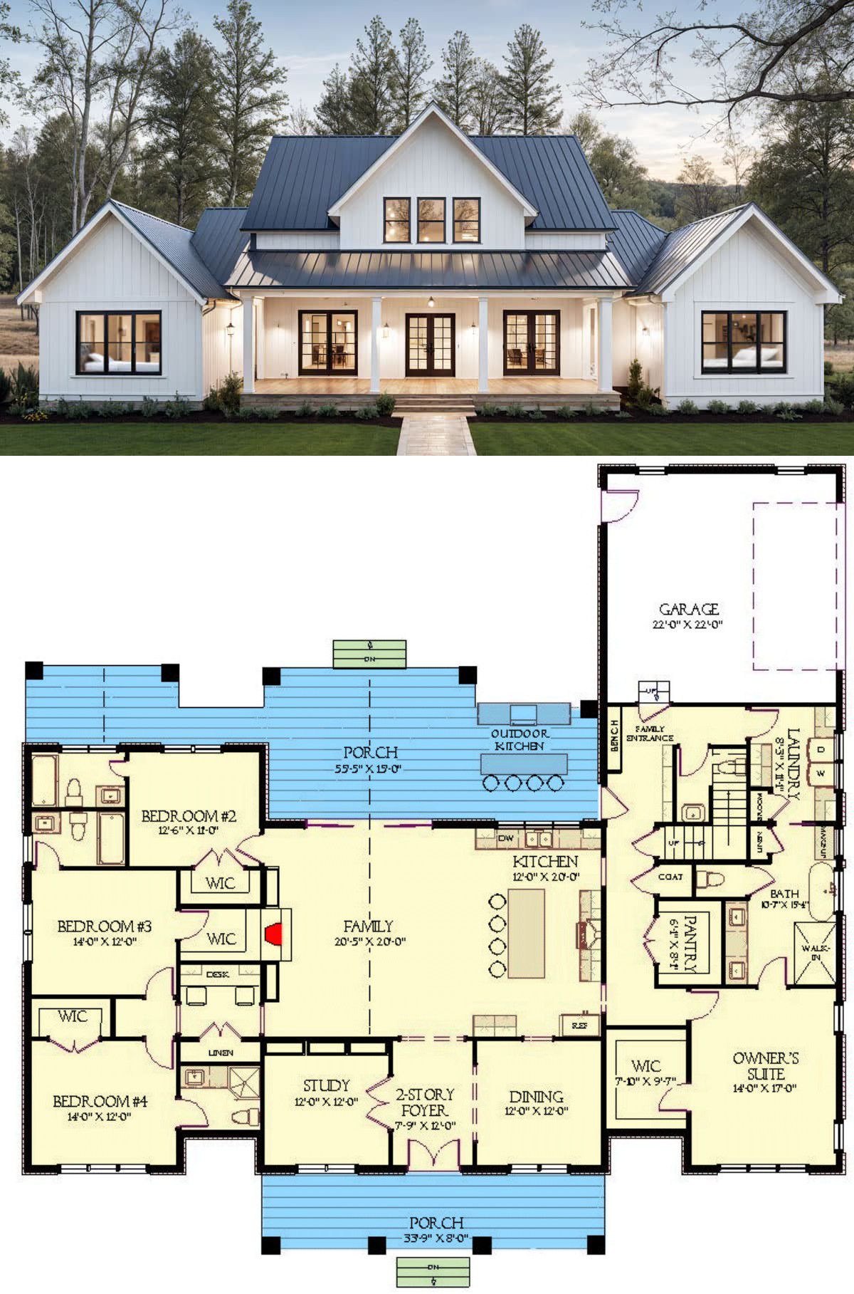 With a 518 sq ft 2-car garage, large front and rear porches, and a huge covered rear patio that includes a built-in outdoor kitchen—it’s your dream of country living with a very modern twist.