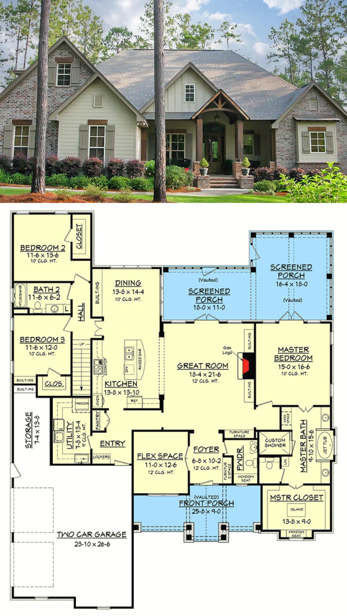 - Key Features: Vaulted great room, rustic trim, stone details, exposed rafters