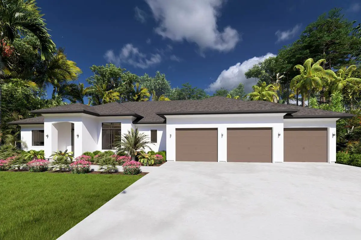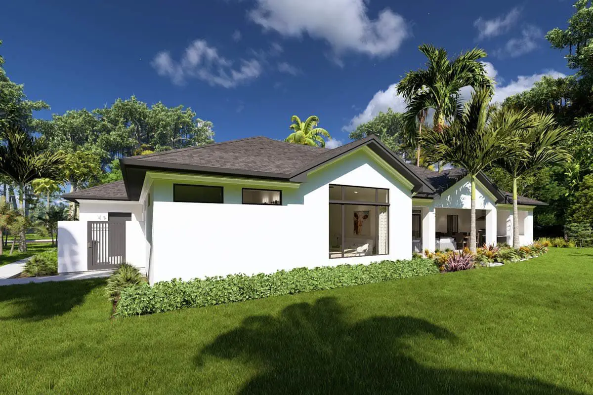 The house features a clean Mediterranean silhouette with stucco-style textures and a gently pitched roof. Its 86′ 4″ wide frontage balances grand scale with cozy warmth.