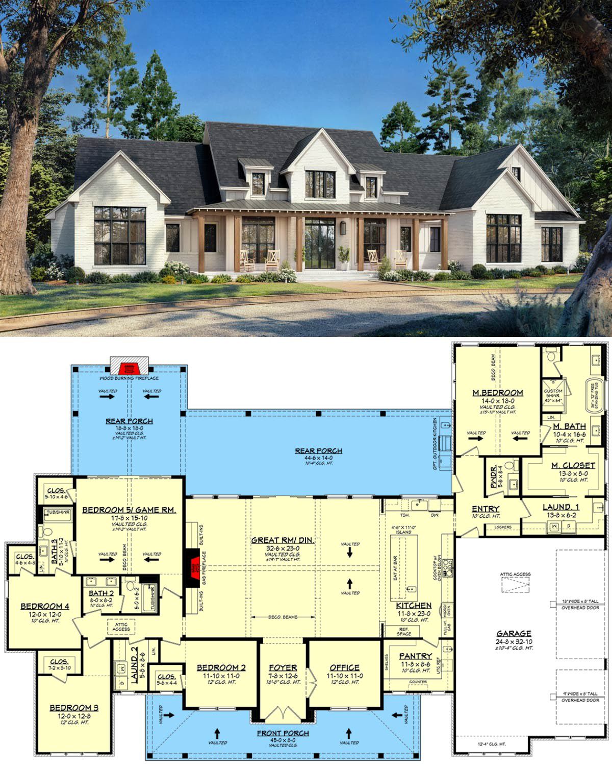 This elegant modern farmhouse spans about 3,500 sq ft on a single level, yet it packs in 5 bedrooms, 3.5 bathrooms, and an attached 3-car garage.