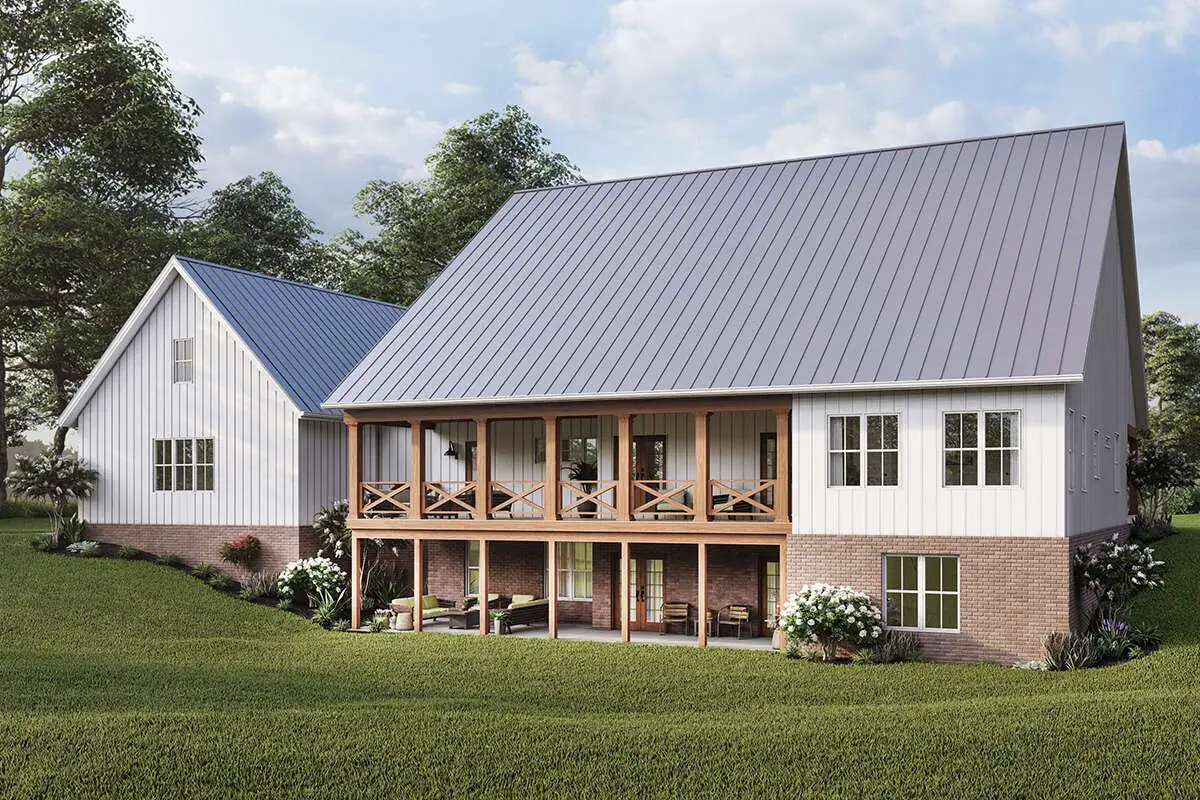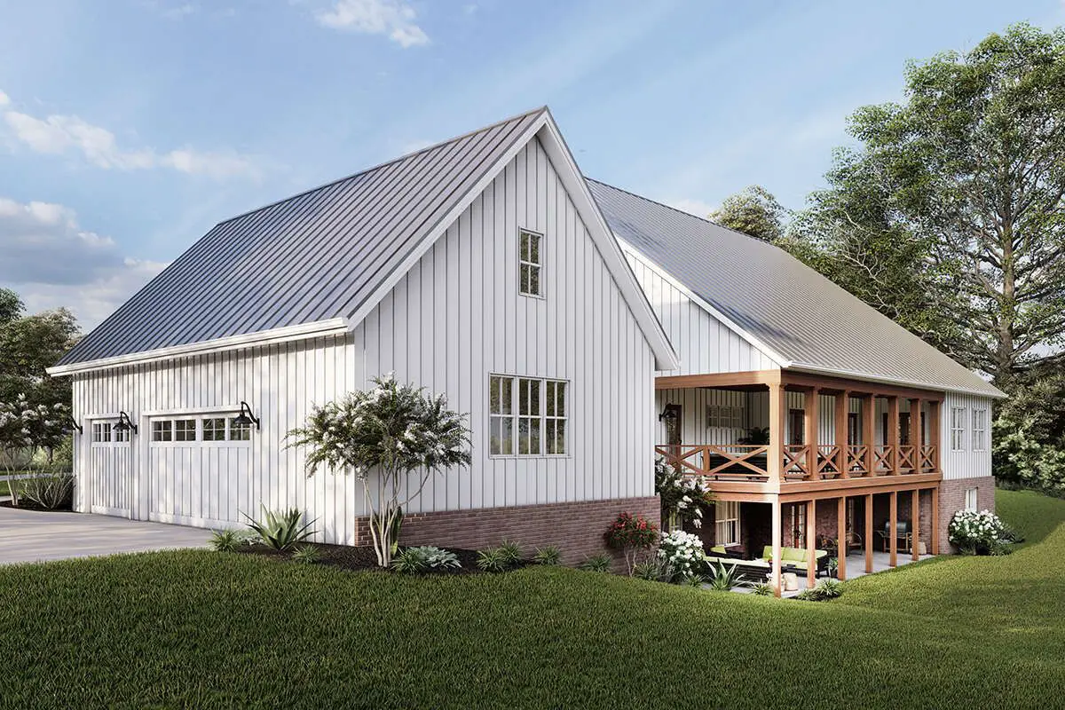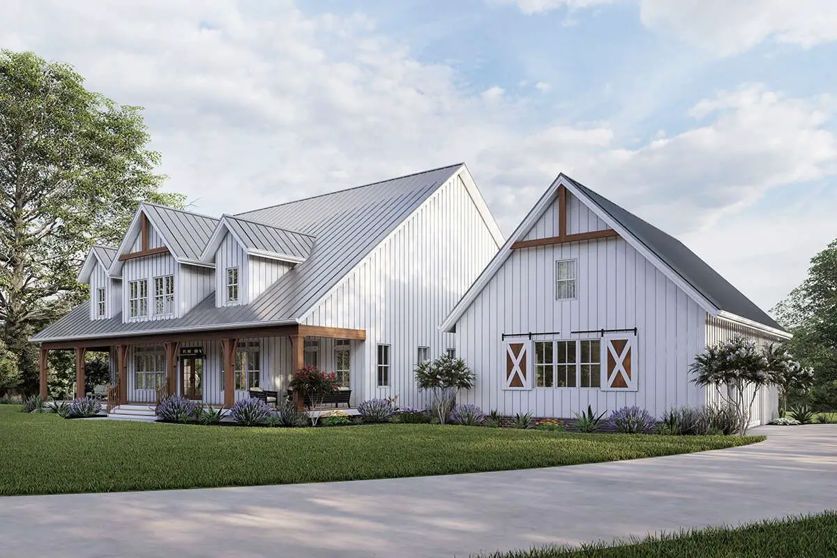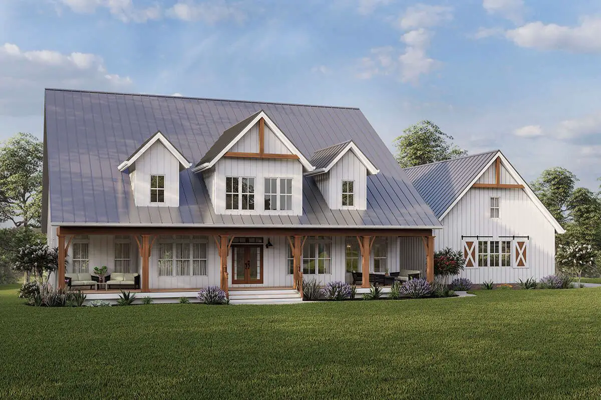 The plan blends traditional farmhouse charm—board-and-batten siding, dormer windows—with high-function modern design.