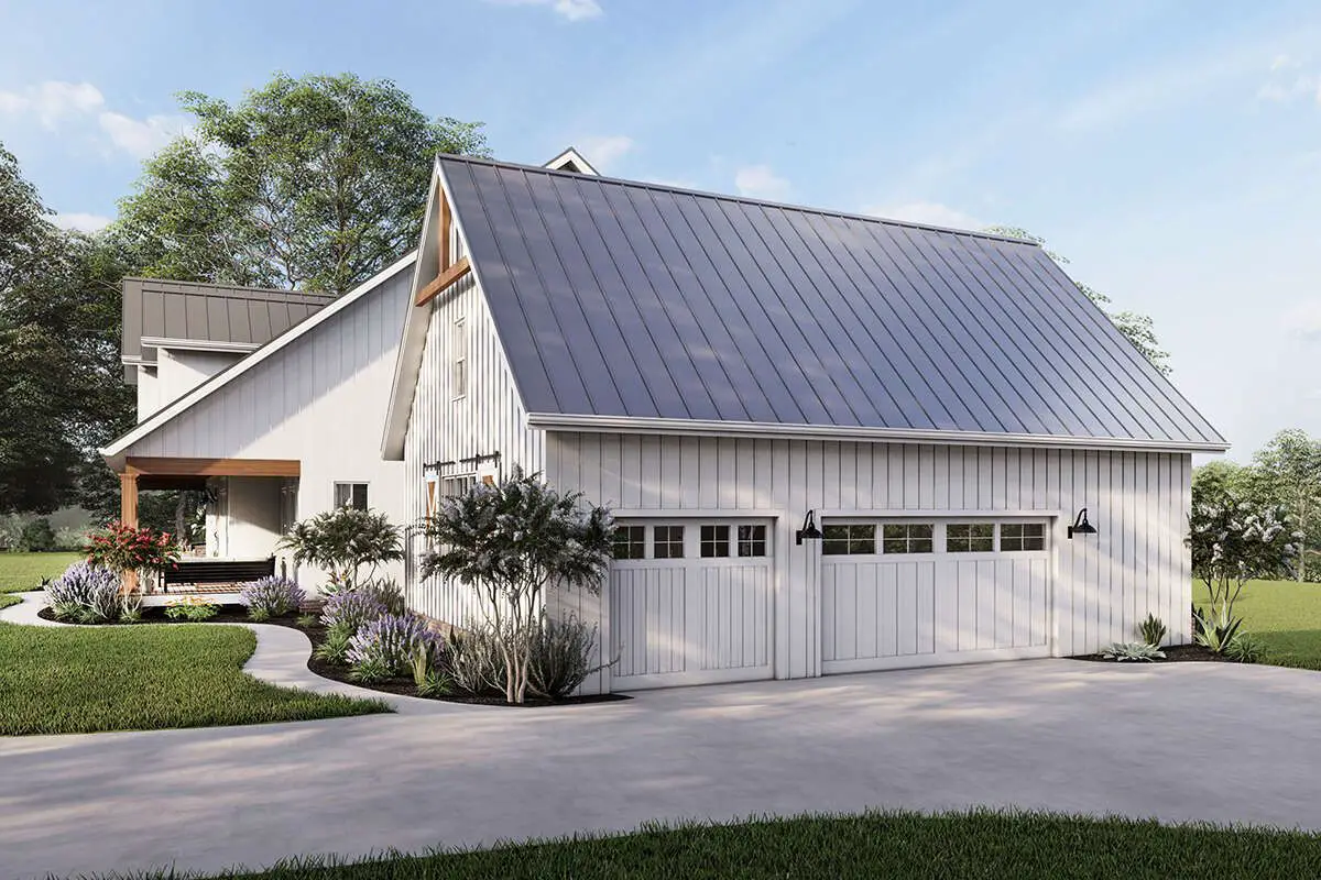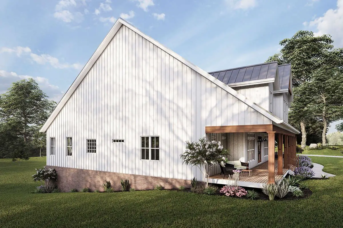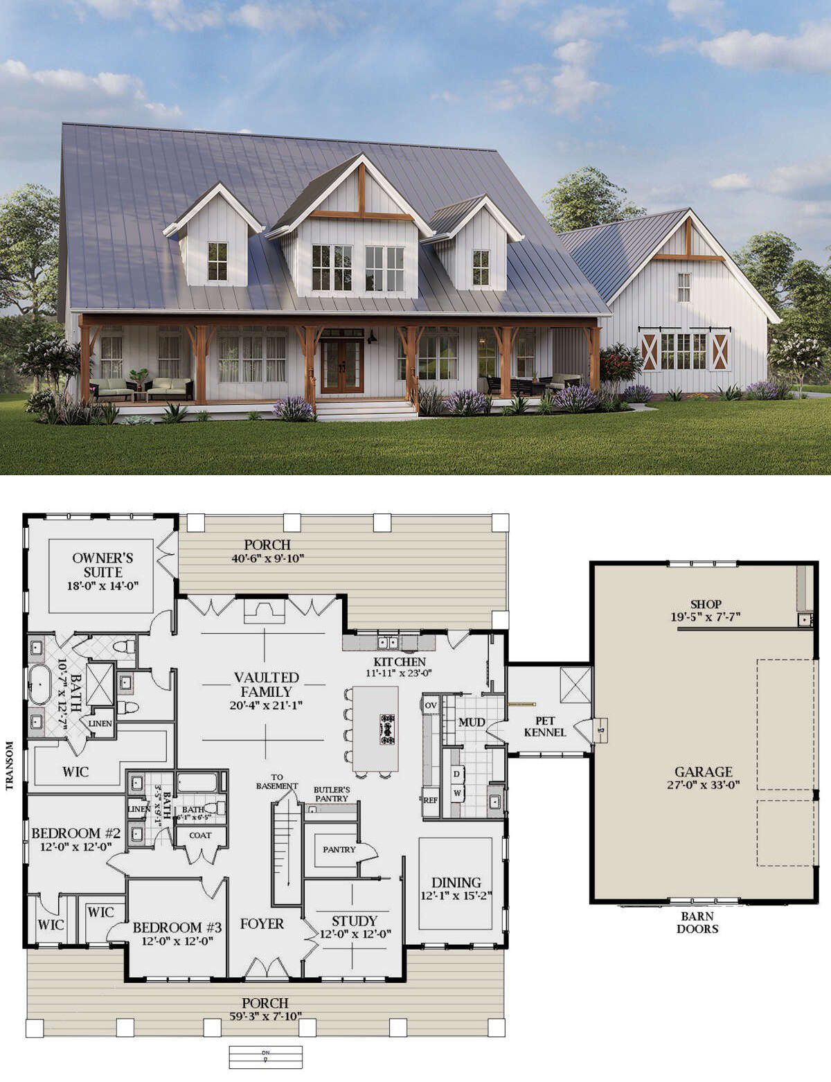 The plan blends traditional farmhouse charm—board-and-batten siding, dormer windows—with high-function modern design.
