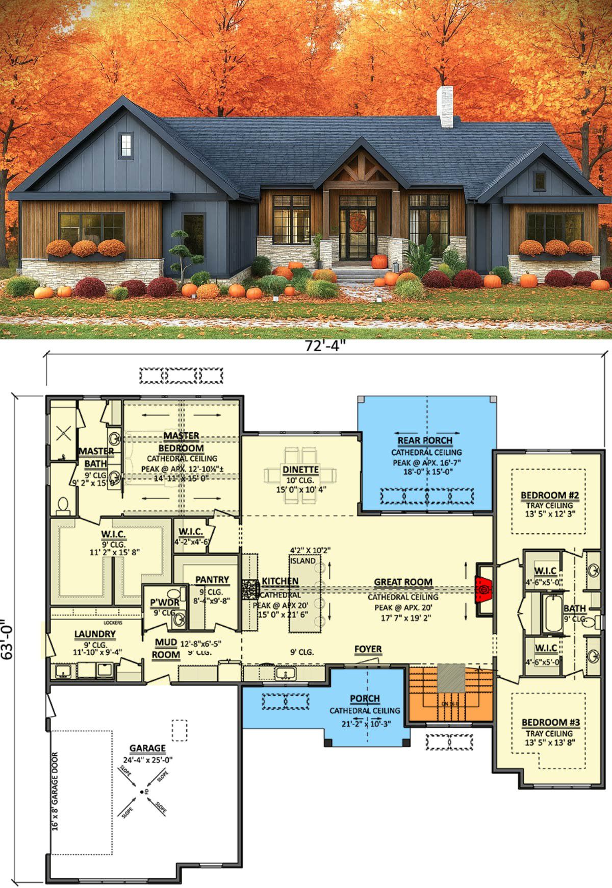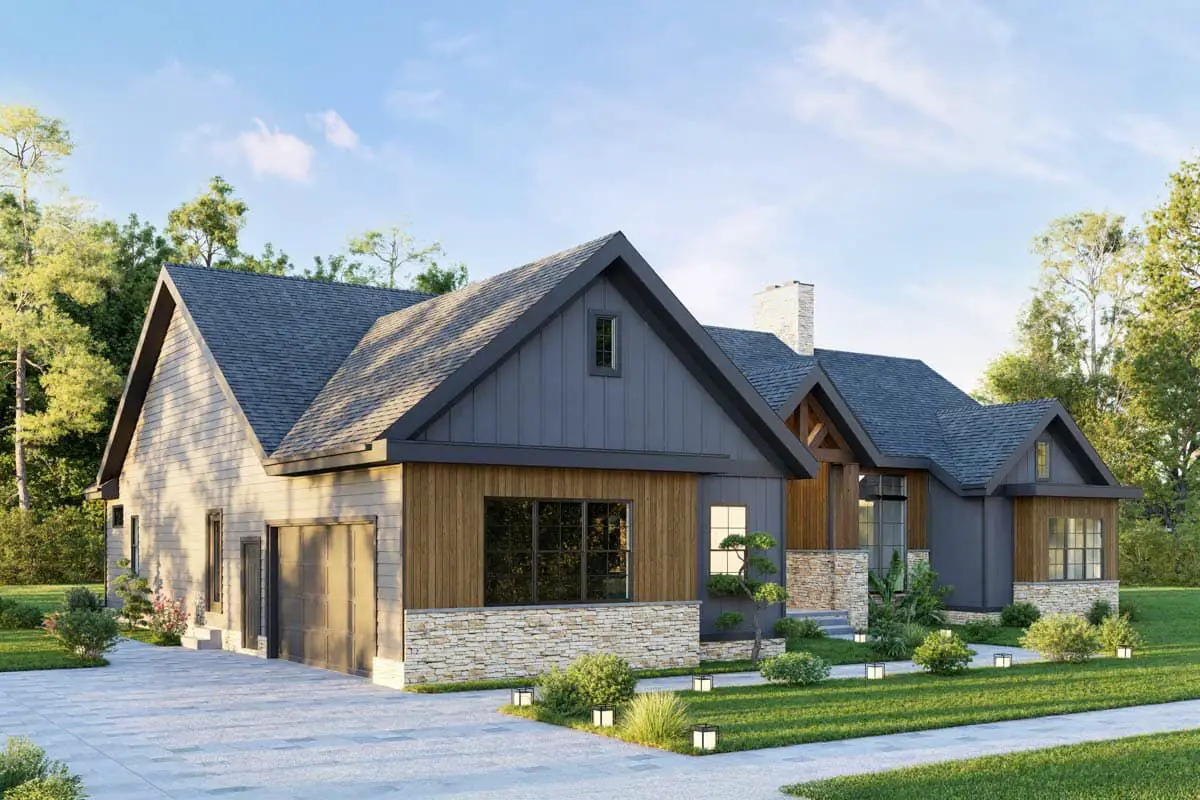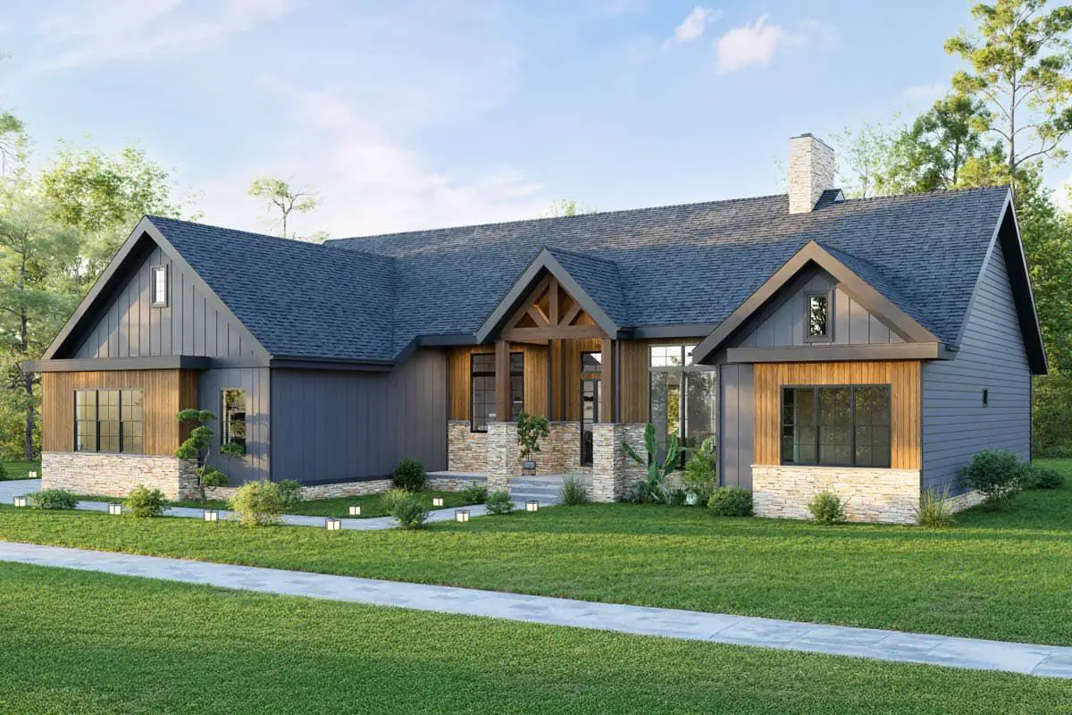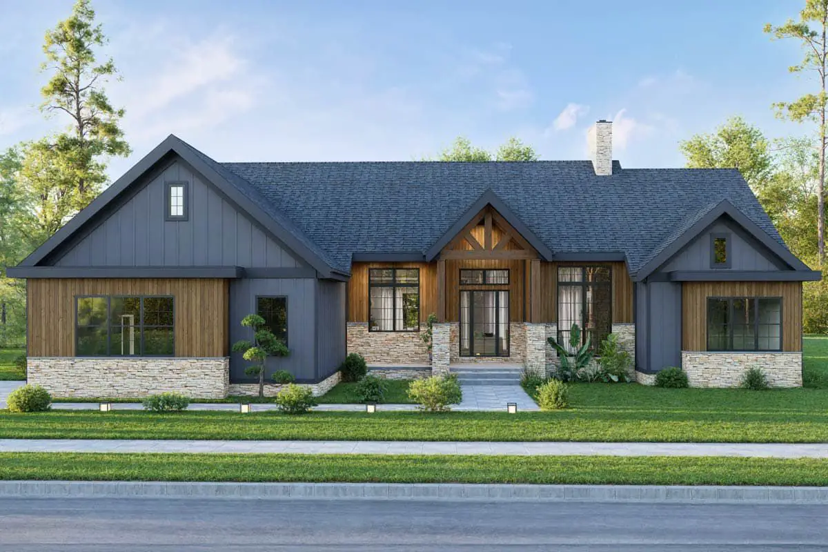 This elegant mountain ranch plan spans approximately 2,503 sq ft on one level, offering 3 bedrooms, 2.5 bathrooms, and a 2-car side-entry garage.