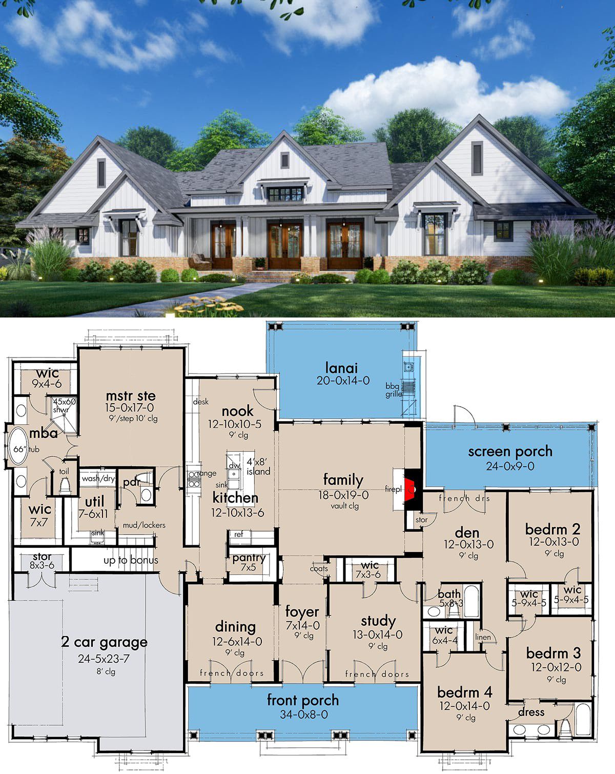 With three defined outdoor areas—**front porch**, **screened porch**, and a **covered lanai**—this design encourages outdoor living in style. The lanai even has space for an outdoor kitchen accessible from the breakfast nook. 1