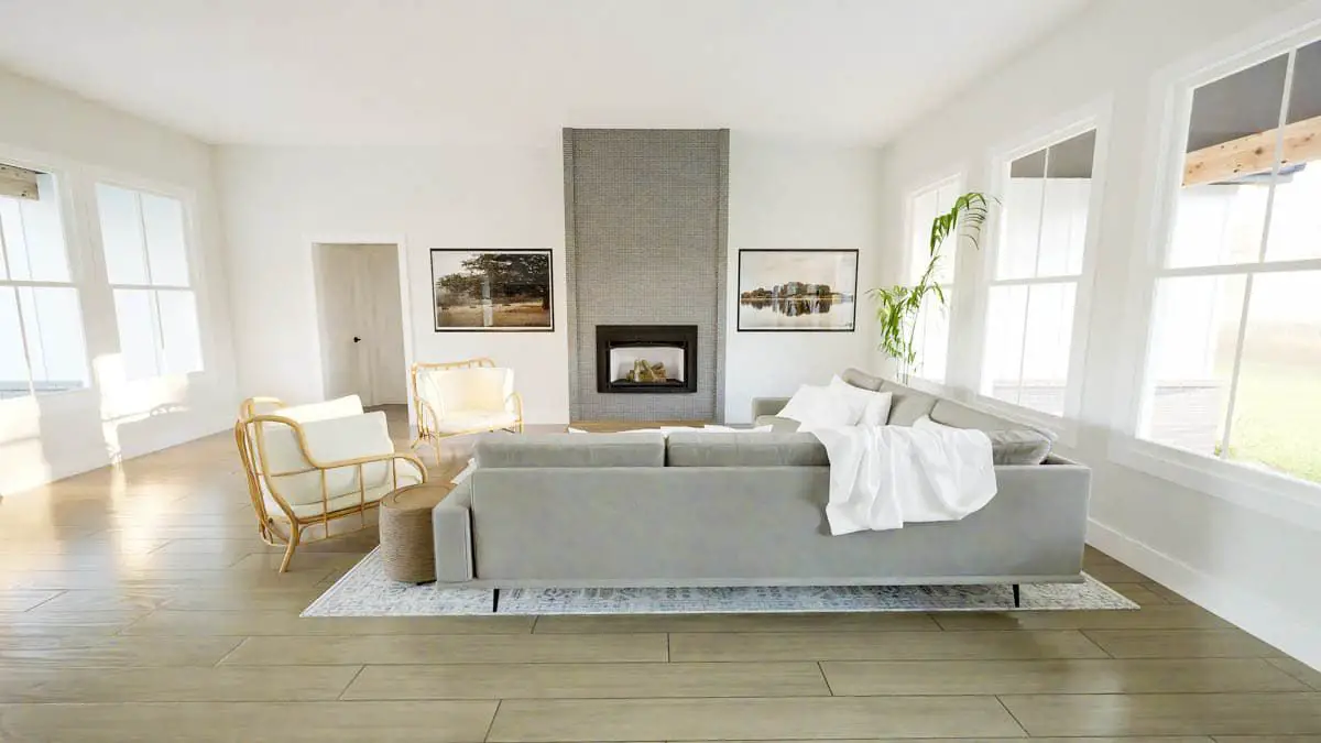 The foyer gives way to a vaulted great room centered around a fireplace and large windows—a cozy gathering place with depth and warmth.