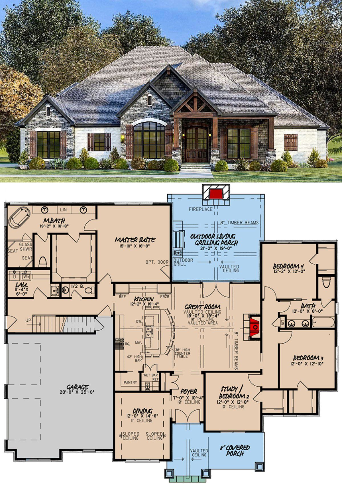 This design blends graceful French Country architecture with extremely practical, flexible living. The vaulted great room offers real drama and connection, the bonus room provides future-ready space, and the sleeping layout accommodates both relaxed family routines and the occasional guest or remote work setup. It’s refined but never stuffy—a home that feels timeless.