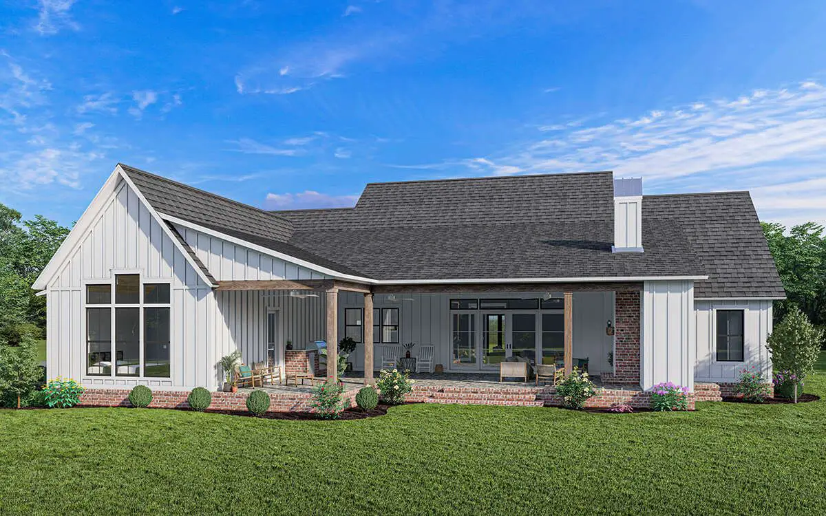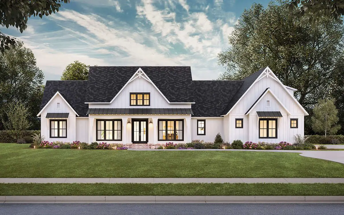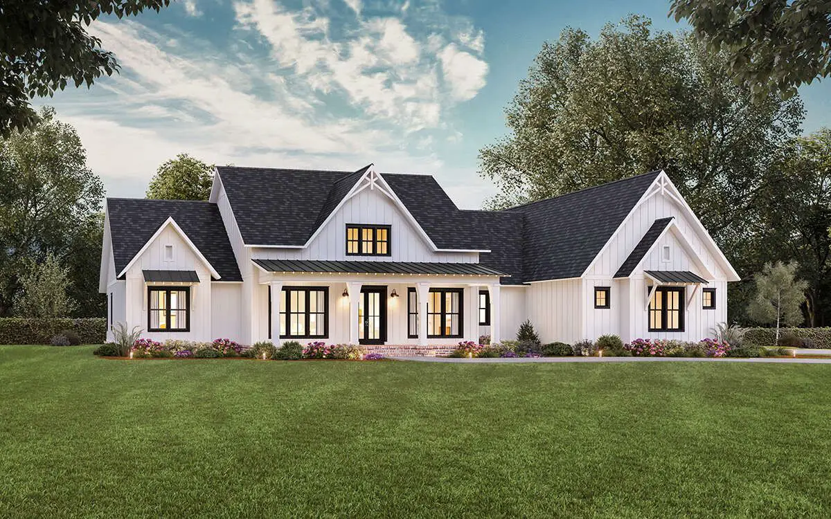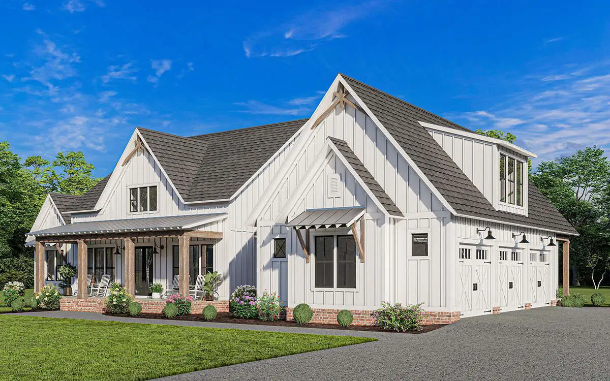 The exterior features a clean, modern farmhouse aesthetic: board-and-batten siding, dormers, and a welcoming front porch that spans the house’s lower pitch. The rooflines and proportions feel balanced and intentional.