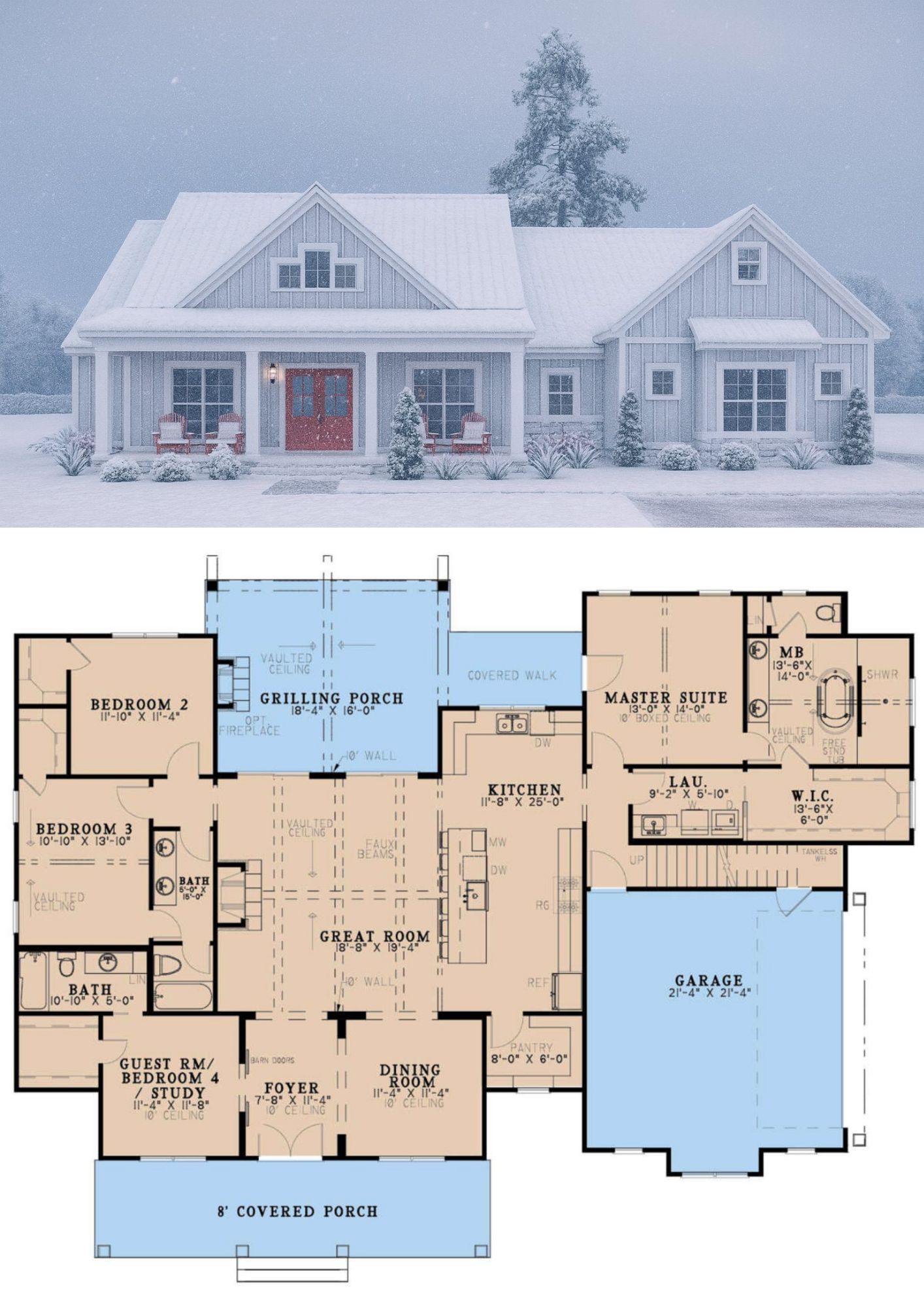This one-level modern farmhouse plan offers about 2,305 sq ft of well-thought-out space, with 4 bedrooms, 3 full bathrooms, and a 2-car garage.