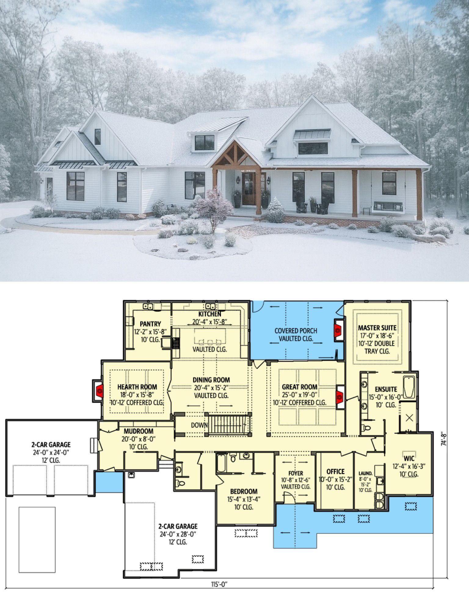 - Dimensions: 115′ wide × 74′-8″ deep, max ridge height 29′ 11