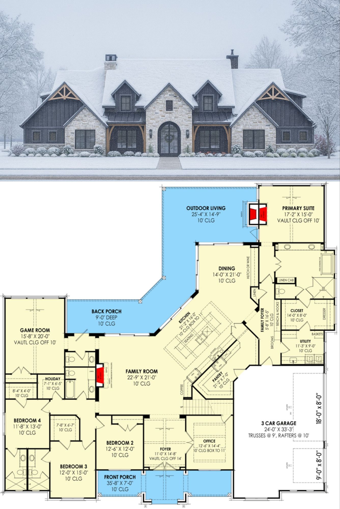 - Split-wing layout gives kids or guests their own zone + a vaulted game room.