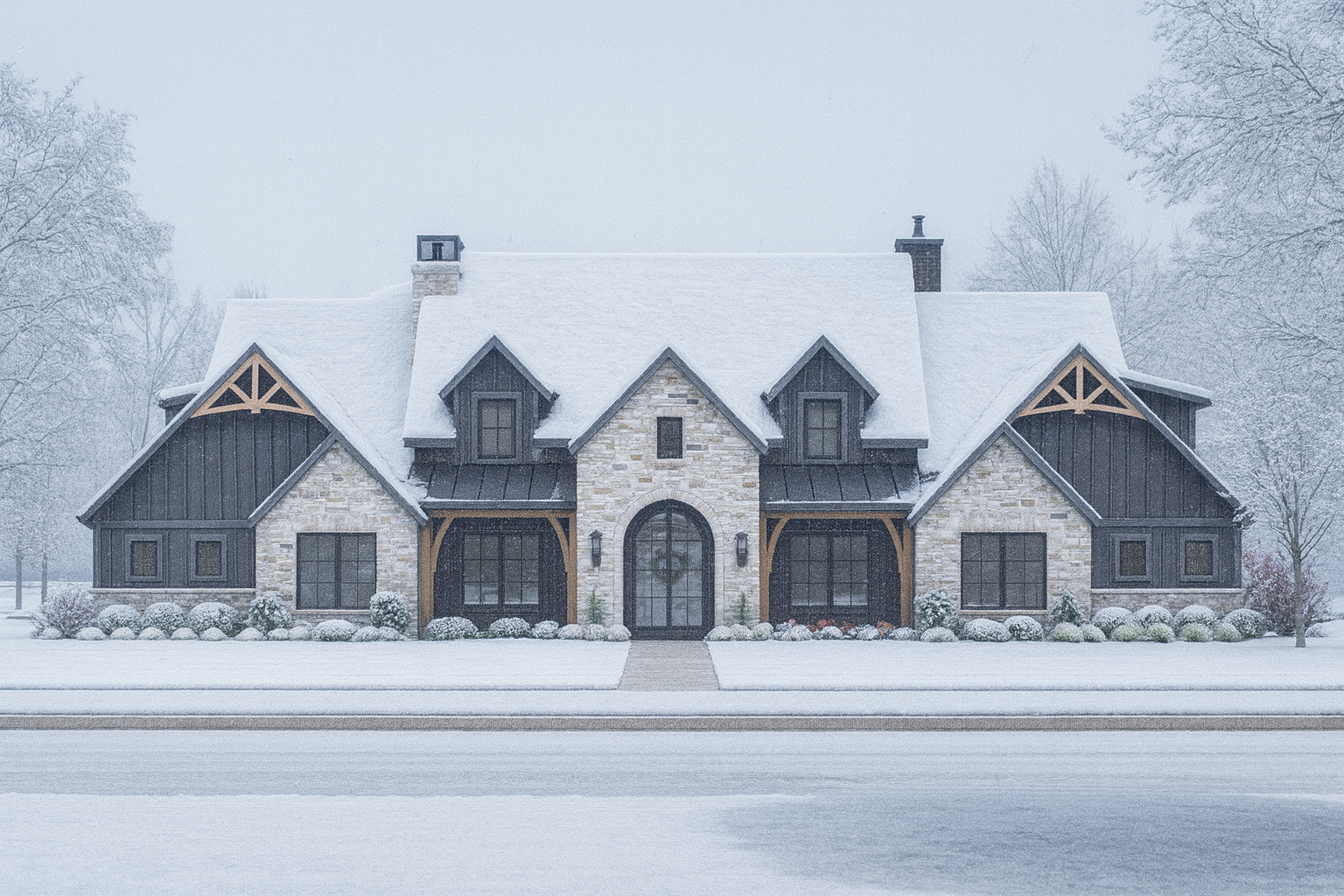 The façade masterfully blends brick, wood, and metal to create perfect symmetry. A pair of arched French doors opens into a vaulted, beamed foyer—setting a tone of elegance and cohesion.