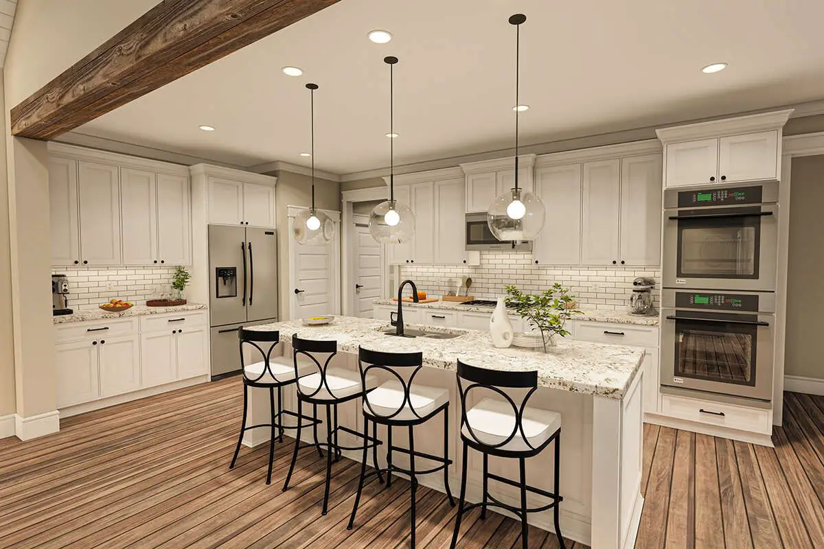 The kitchen features an oversized island with seating for four, offering generous prep space, casual dining, or a breakfast bar for busy mornings or guest visits.