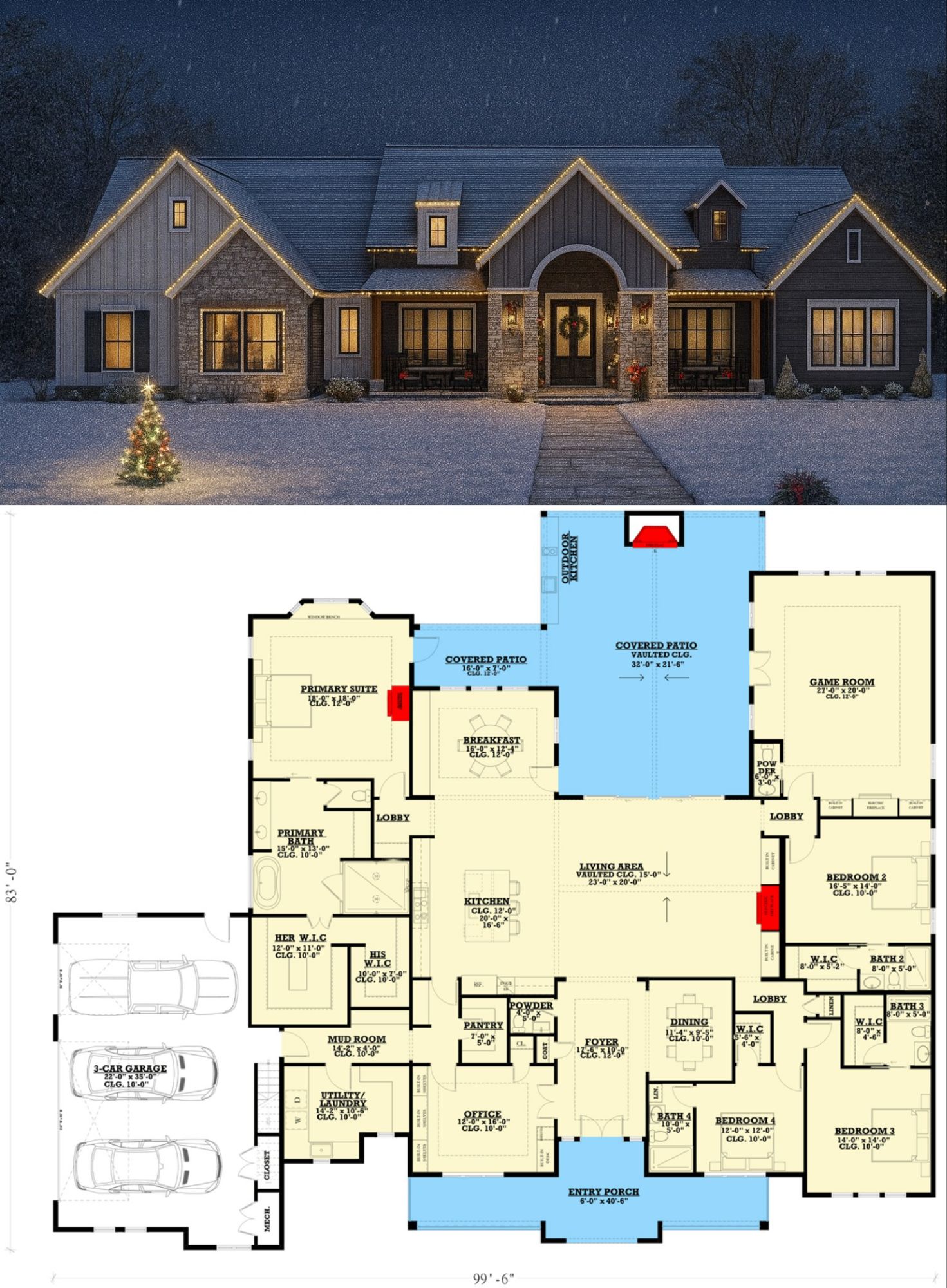 This 4,187-square-foot transitional-style farmhouse plan delivers on both comfort and entertainment — with 4 bedrooms, 4 full baths + 2 half-baths, a roomy 3-car garage, and a massive indoor game/rec room plus generous outdoor living space.