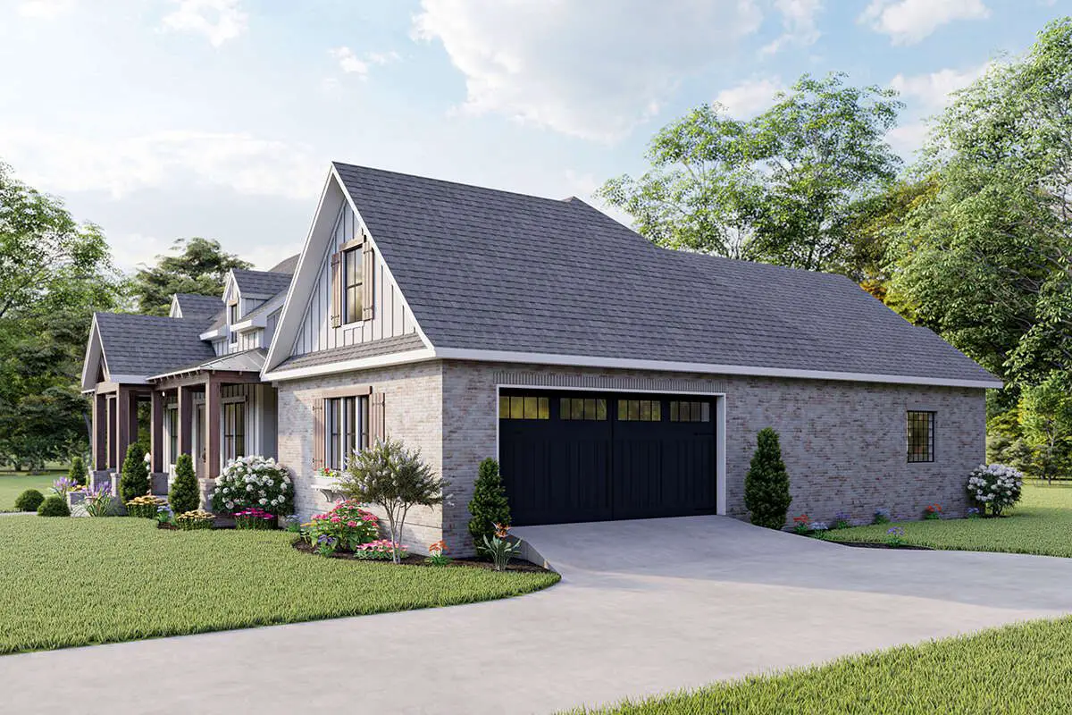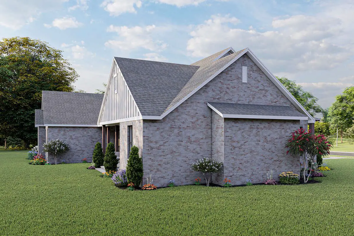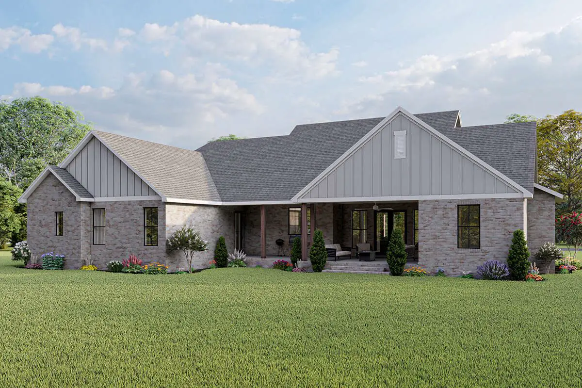 To the side, the 2-car garage tucks in neatly with a side-entry layout so the front elevation stays all about the house, not about garage doors. Around the back, the covered porch becomes a full-blown outdoor living area, complete with space for an outdoor kitchen. This is where grilling, football watching, or chill weekend hangouts will happen.