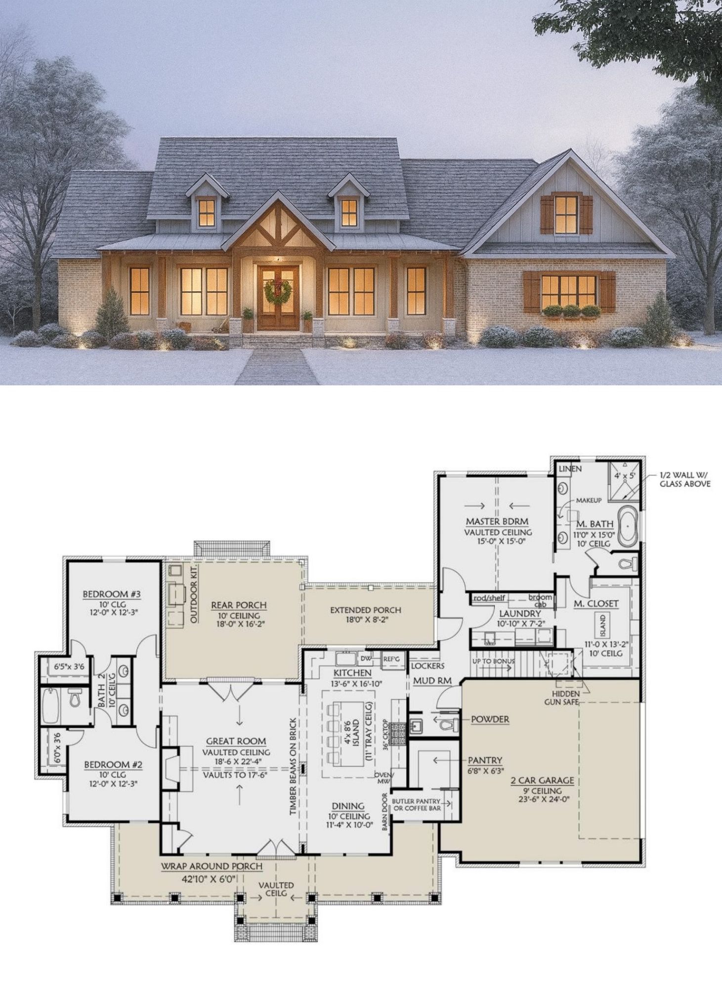 You get an inviting exterior, a vaulted great room, a kitchen that can handle serious cooking and hosting, a private owner’s wing with hotel-level bathroom, and flexible space for guests, work, or future changes.