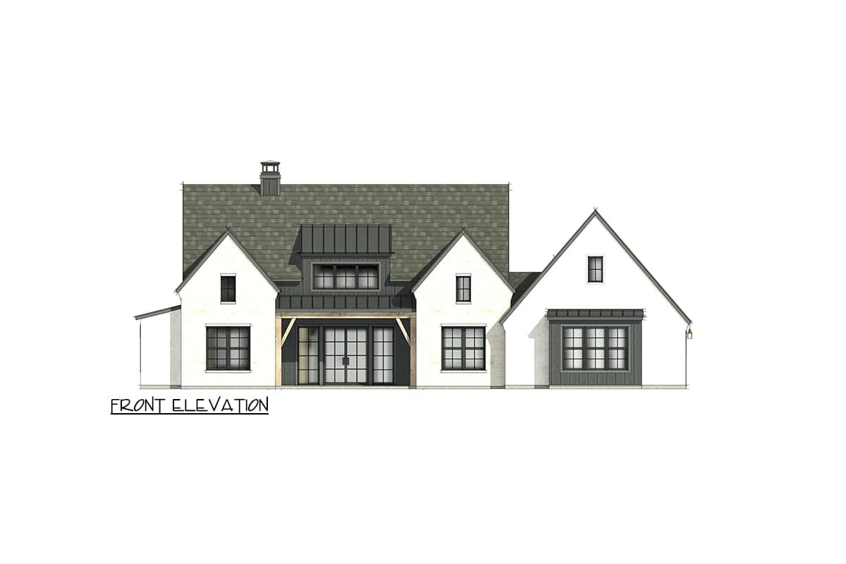 The front porch is just over six feet deep, so it’s not just decorative – you can actually put chairs there and use it. A pair of French doors creates a classy entry moment, and because the garage is side-entry, the focus stays on the house instead of a wall of garage doors.