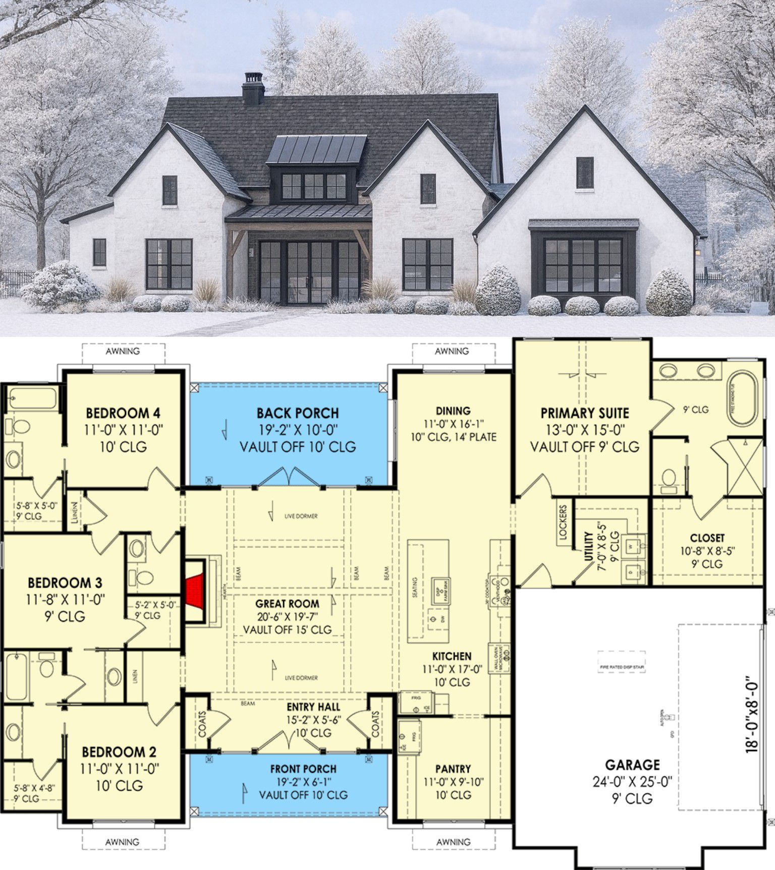 You get 4 true bedrooms, 3.5 bathrooms, a vaulted great room, side-entry 2-car garage, and porches front and back that make the house feel bigger than it is.