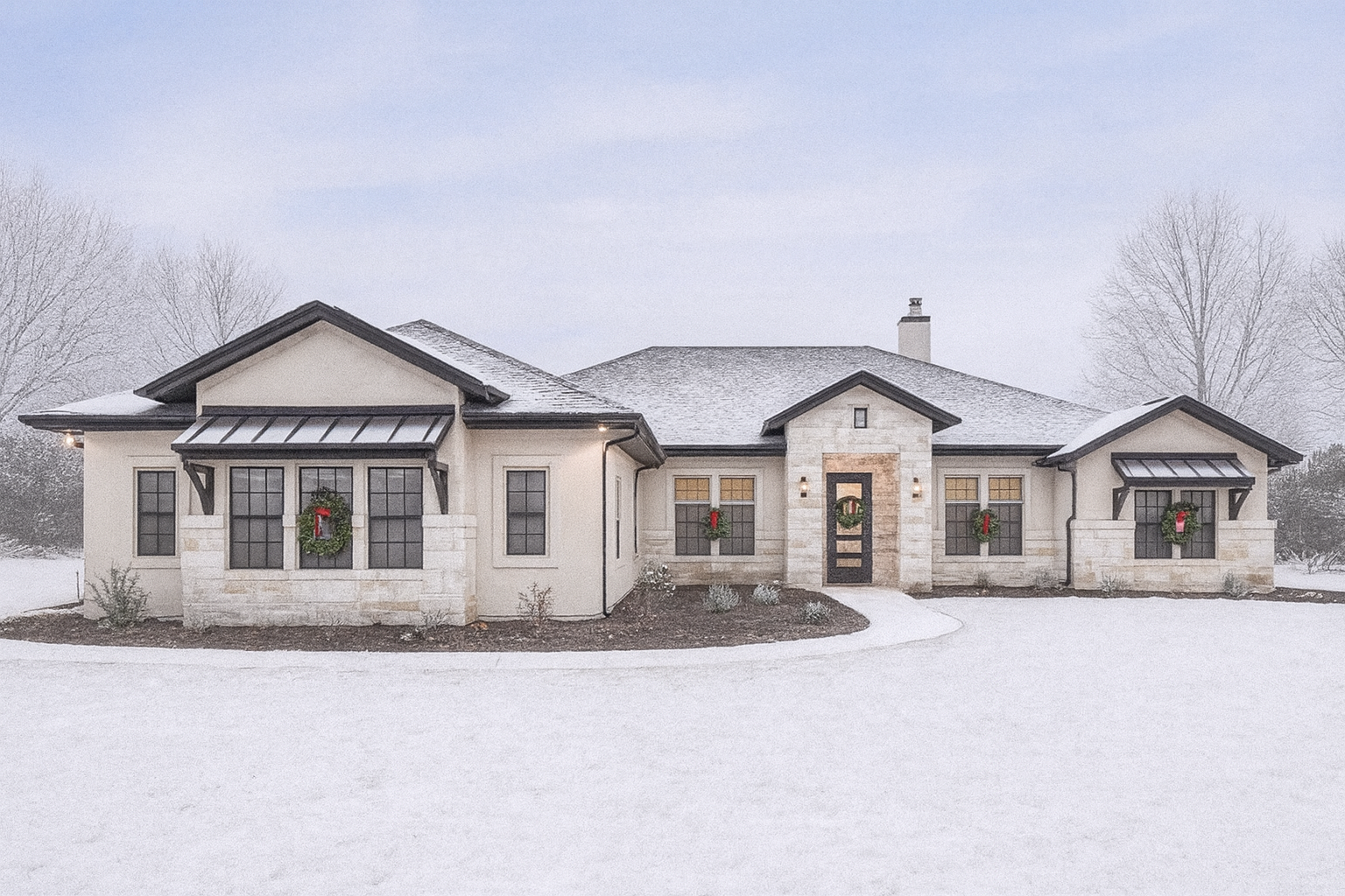 The exterior of the home carries a Texas/Hill-Country ranch style — often using a mix of stone and stucco for a textured, natural look.