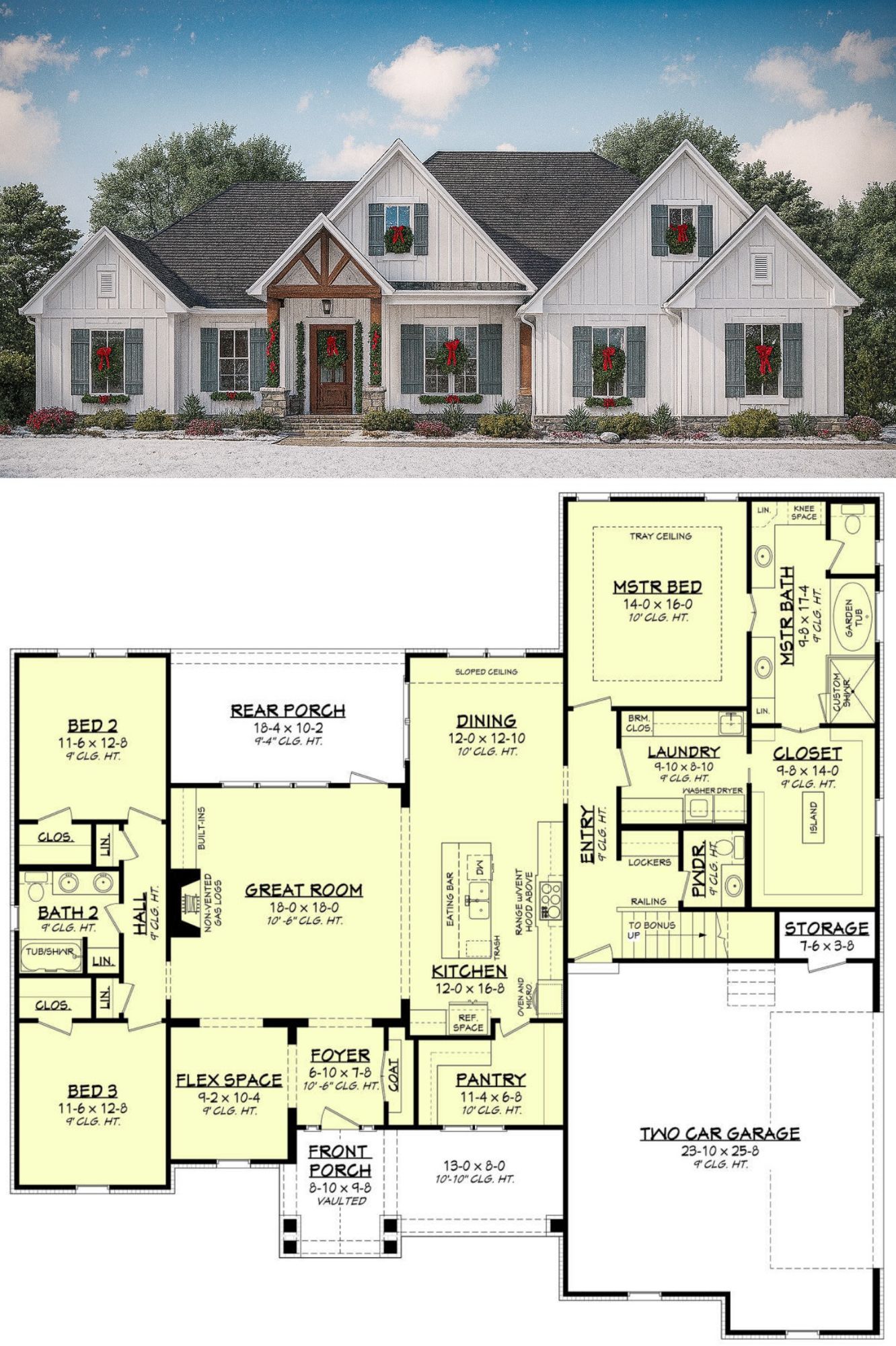 The side-entry garage keeps the front elevation polished and uncluttered, while the matching rear porch invites outdoor relaxation or weekend gatherings.