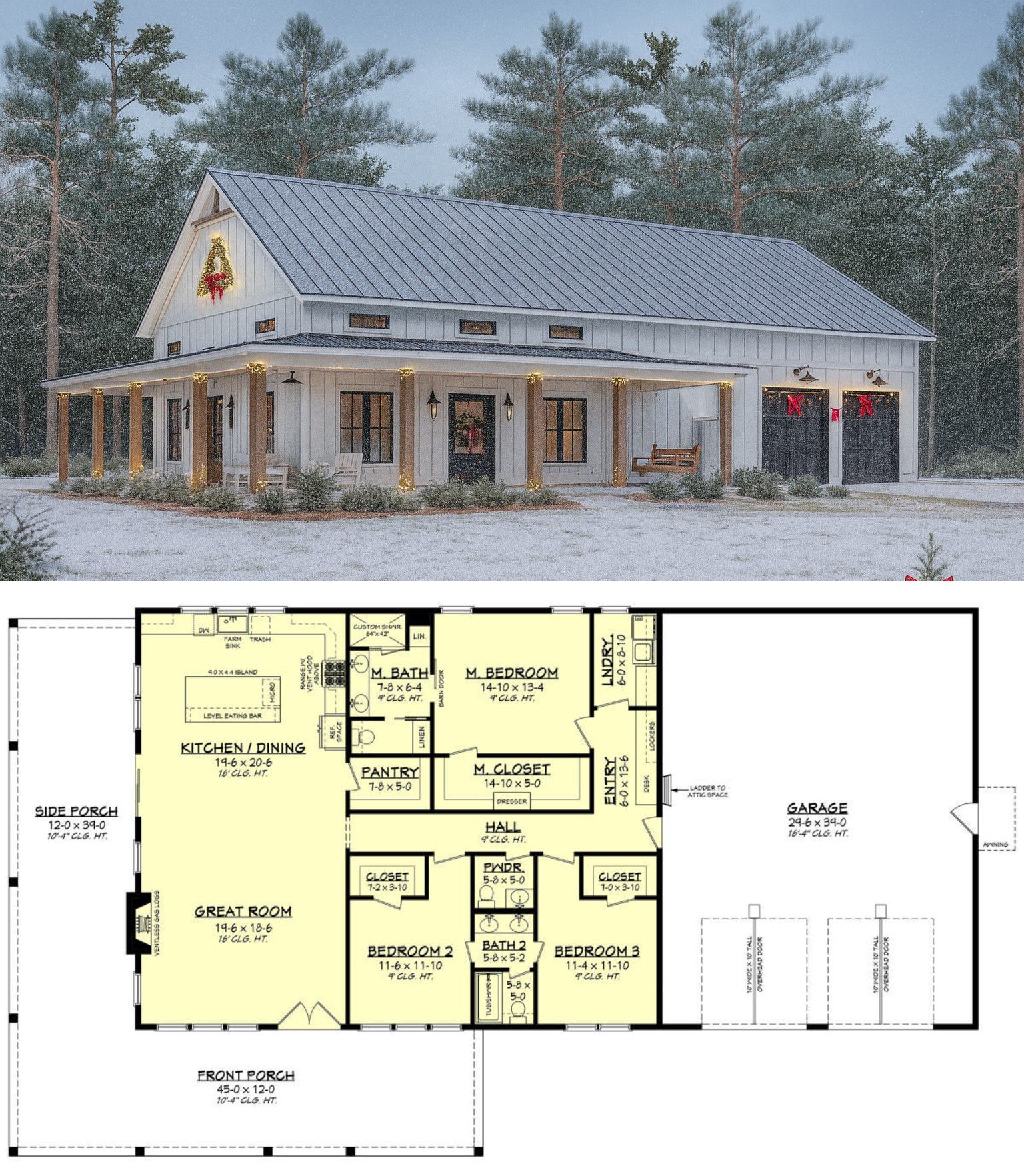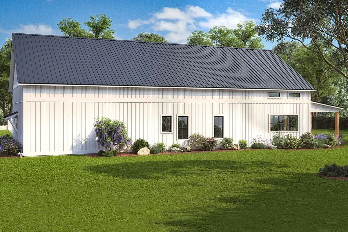 This barndominium plan offers approximately 2,000 sq ft of efficient and flexible living space, with 3 bedrooms and 2½ bathrooms.