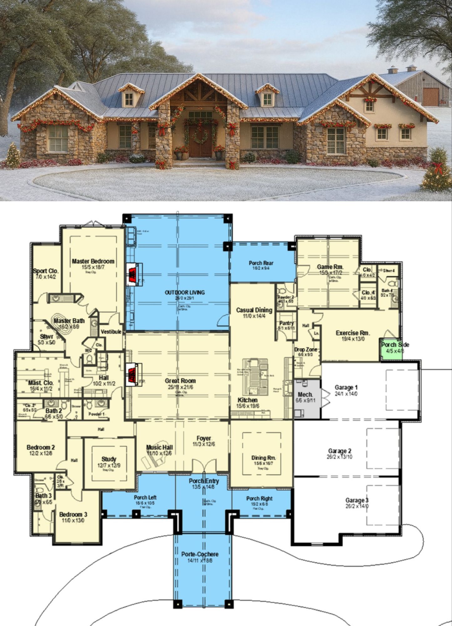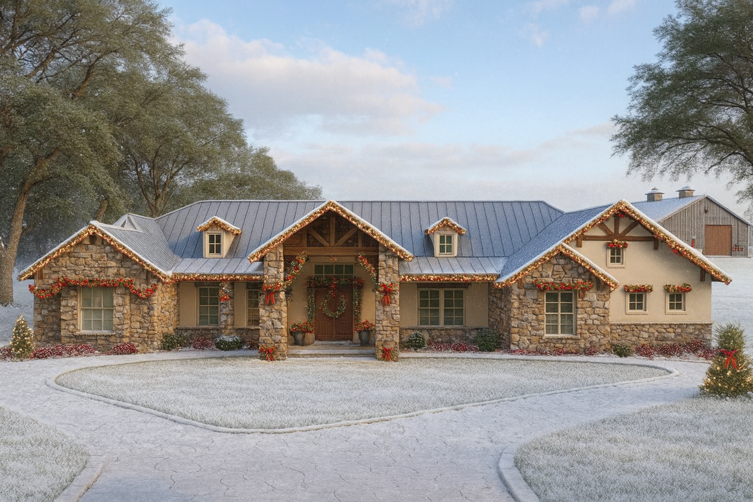 The exterior embraces timeless “Hill Country” charm, featuring a stone-accented façade, a broad porte-cochère at the front, and a side-entry 3-car garage (≈ 1,219 sq ft) that keeps vehicles tucked away and preserves curb appeal.