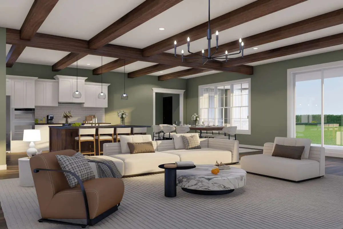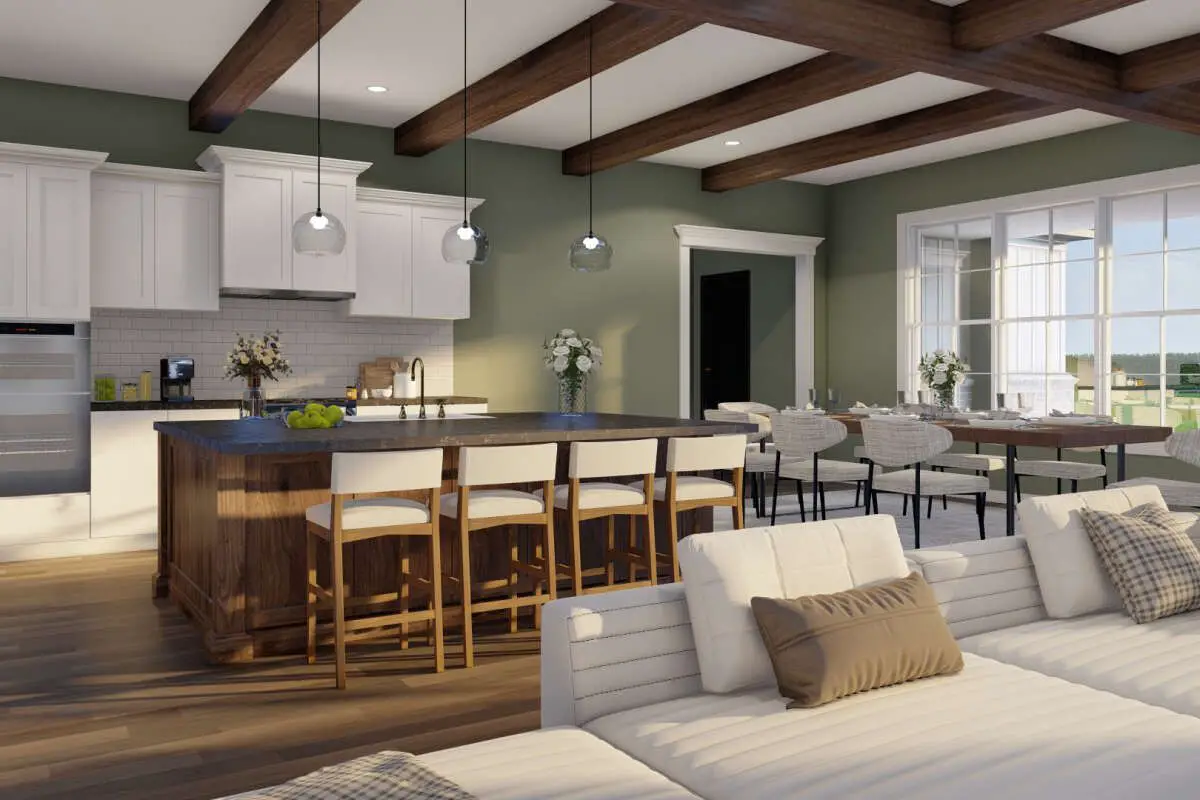Inside, high ceilings (10 ft on main floor) set a tone of spaciousness and light. 2 The main living areas — kitchen, dining, and living/family rooms — are designed to flow together naturally, creating generous, connected spaces for everyday life and entertaining.