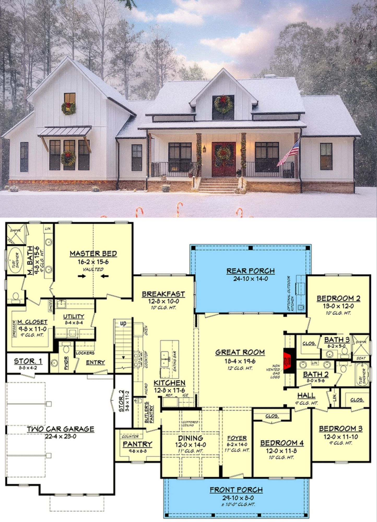 This plan stands out for blending compact efficiency with flexible, family-ready design. The open layout and volume ceilings create a spacious, modern feel while the 4 bedrooms + bonus room accommodate changing needs (kids, guests, home office, hobbies). It’s a practical, stylish home — ideal if you want farmhouse charm without excess, and enough room to grow.