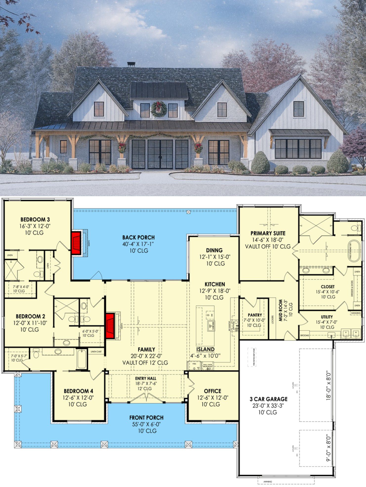 This modern-farmhouse plan provides ~ 3,254 sq ft of living space, with 4 bedrooms, 4 full baths + 1 half bath, a 3-car garage, a home office, and direct laundry access from the master suite — a blend of comfort, convenience, and flexibility.
