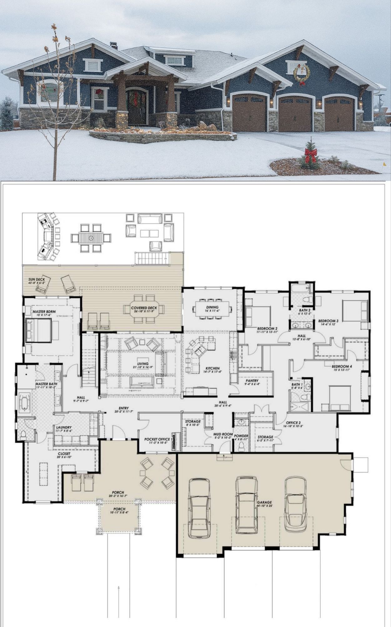 This spacious Craftsman home plan provides about 3,968 sq ft of thoughtfully organized living space, with 4 bedrooms and 3½ bathrooms.