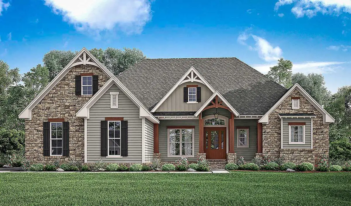The exterior leans into rustic-Craftsman charm: expect mixed materials (wood/stone accents typical of Craftsman style), a welcoming front — possibly with a porch — and a form that blends traditional warmth with functional simplicity.