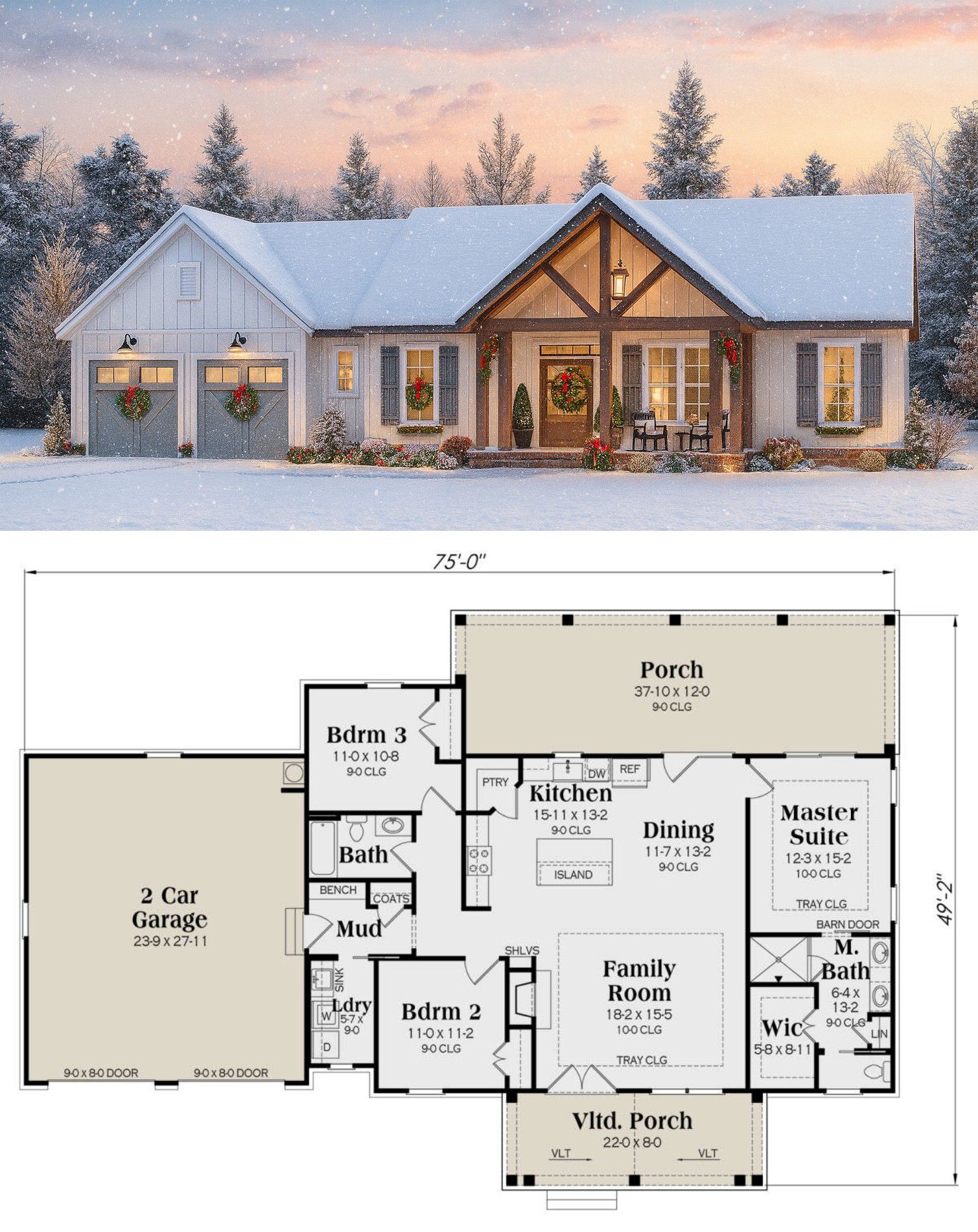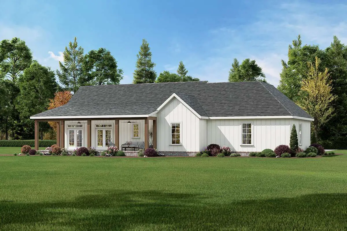 This efficient modern-farmhouse design delivers about 1,553 sq ft of cozy, smart living space, with 3 bedrooms and 2 bathrooms.