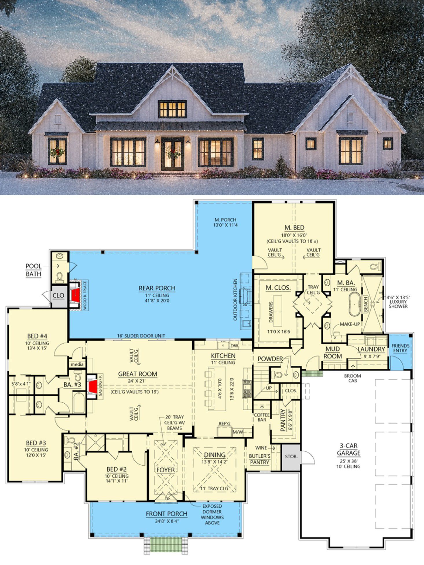 The open main living area, vaulted ceilings, and extended outdoor spaces make it ideal for family life, entertaining, or relaxed living — all wrapped in modern-farmhouse style.