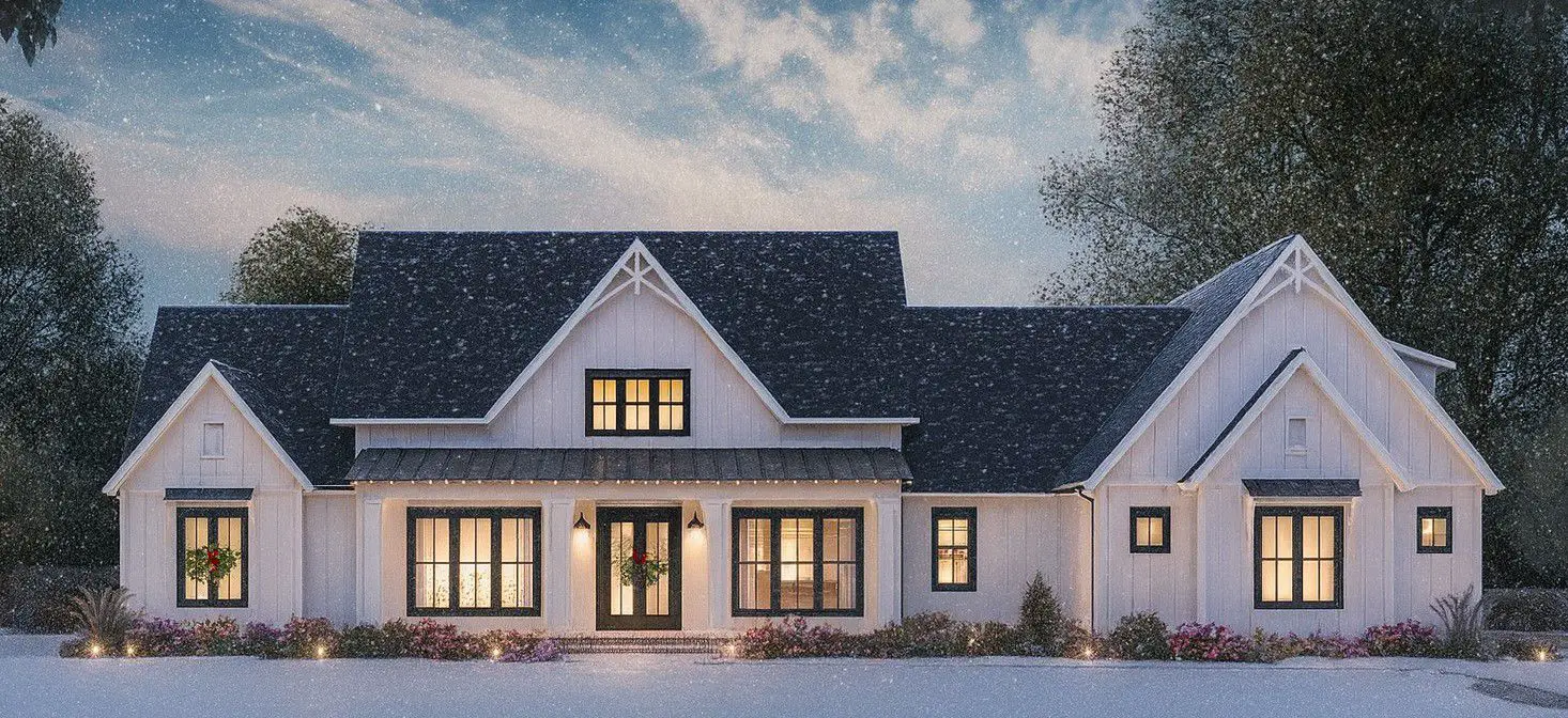 Board-and-batten siding, a deep front porch (≈ 8′-4″), and a symmetrical gabled dormer over the front French-door entry give the exterior classic farmhouse charm with modern appeal.