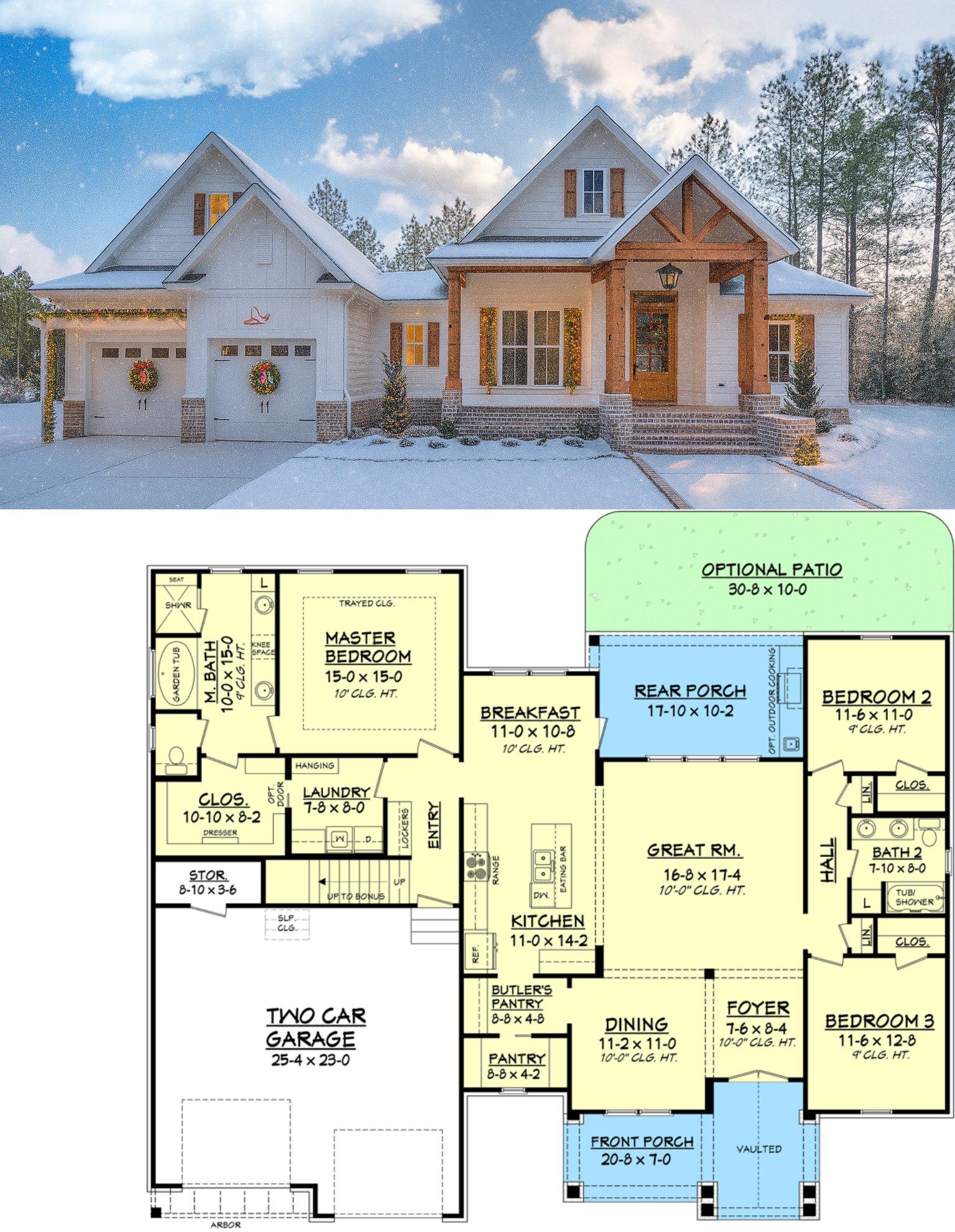The exterior features Craftsman-style elements: exposed trusses and beams on the front porch, an arbor over the garage, and comfortable proportions (~66′-6″ wide by 54′ deep) — giving a cozy yet polished curb appeal.