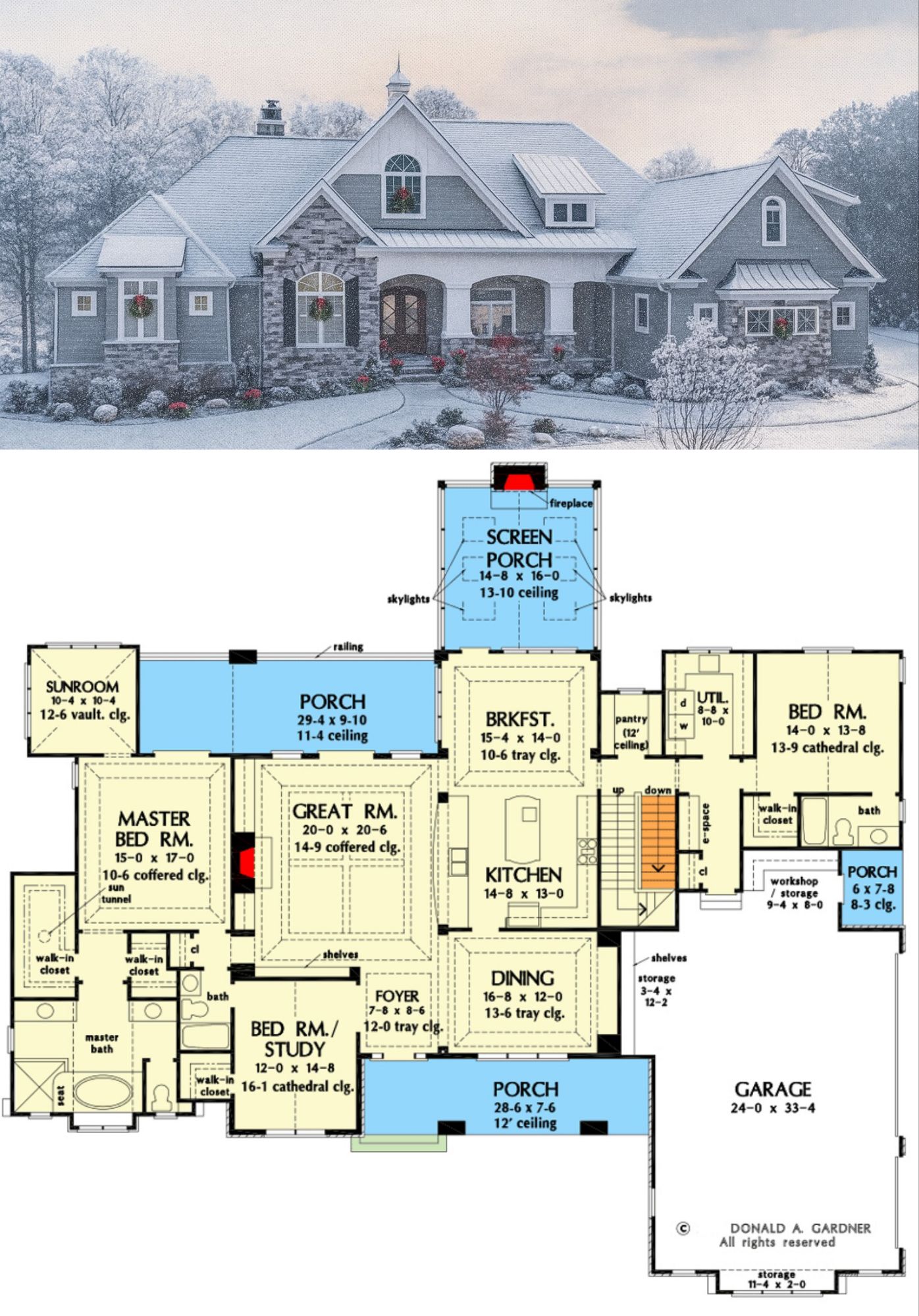 A rear screened porch (cathedral ceiling ~13′-10″ with skylight + fireplace) connects to living areas — offering a seamless indoor-outdoor lifestyle. 6