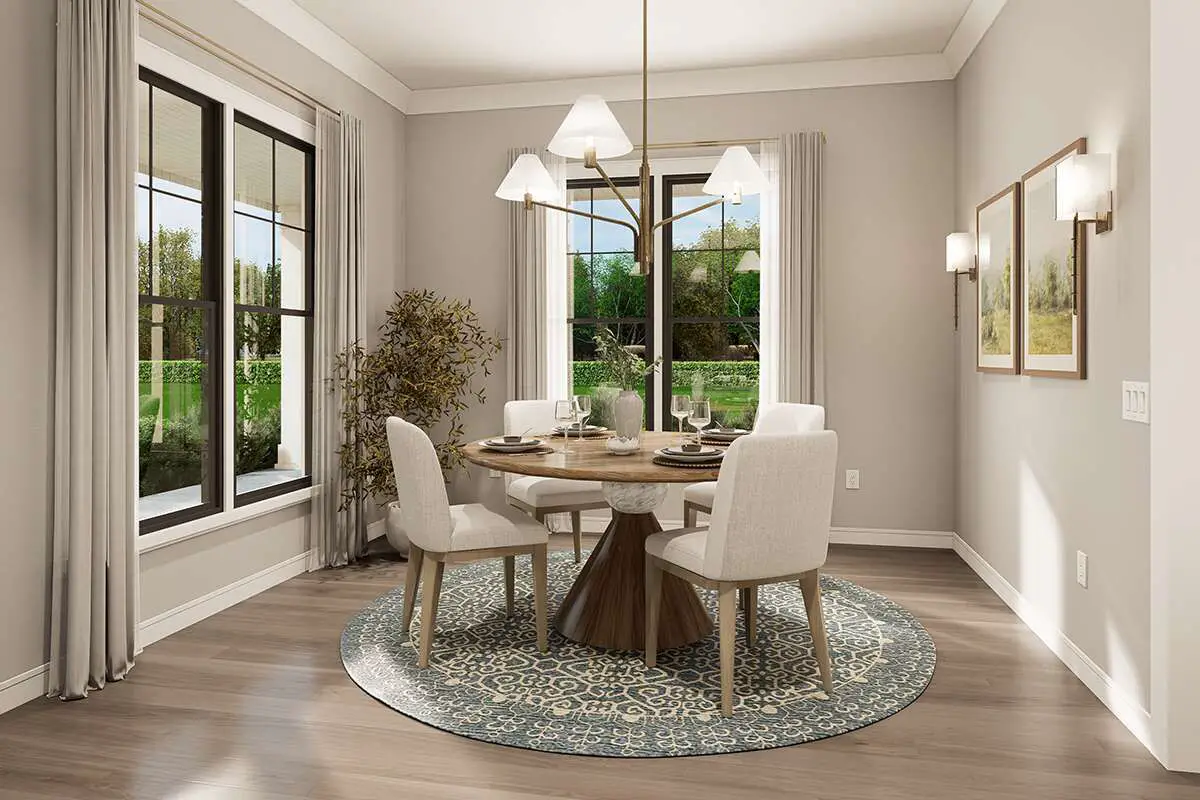 The kitchen includes a center island and a walk-in pantry, giving practical prep and storage space. The dining area can comfortably seat a family of six to eight.
