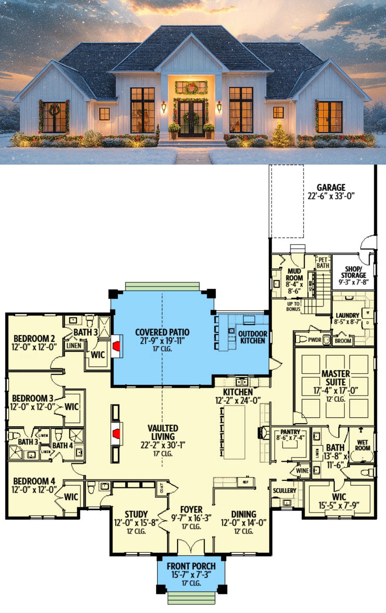 This plan blends **grand scale and thoughtful design** — the two-story great room and open layout create a sense of spaciousness and flow, while the well-zoned bedroom wings and bonus room offer privacy and flexibility.