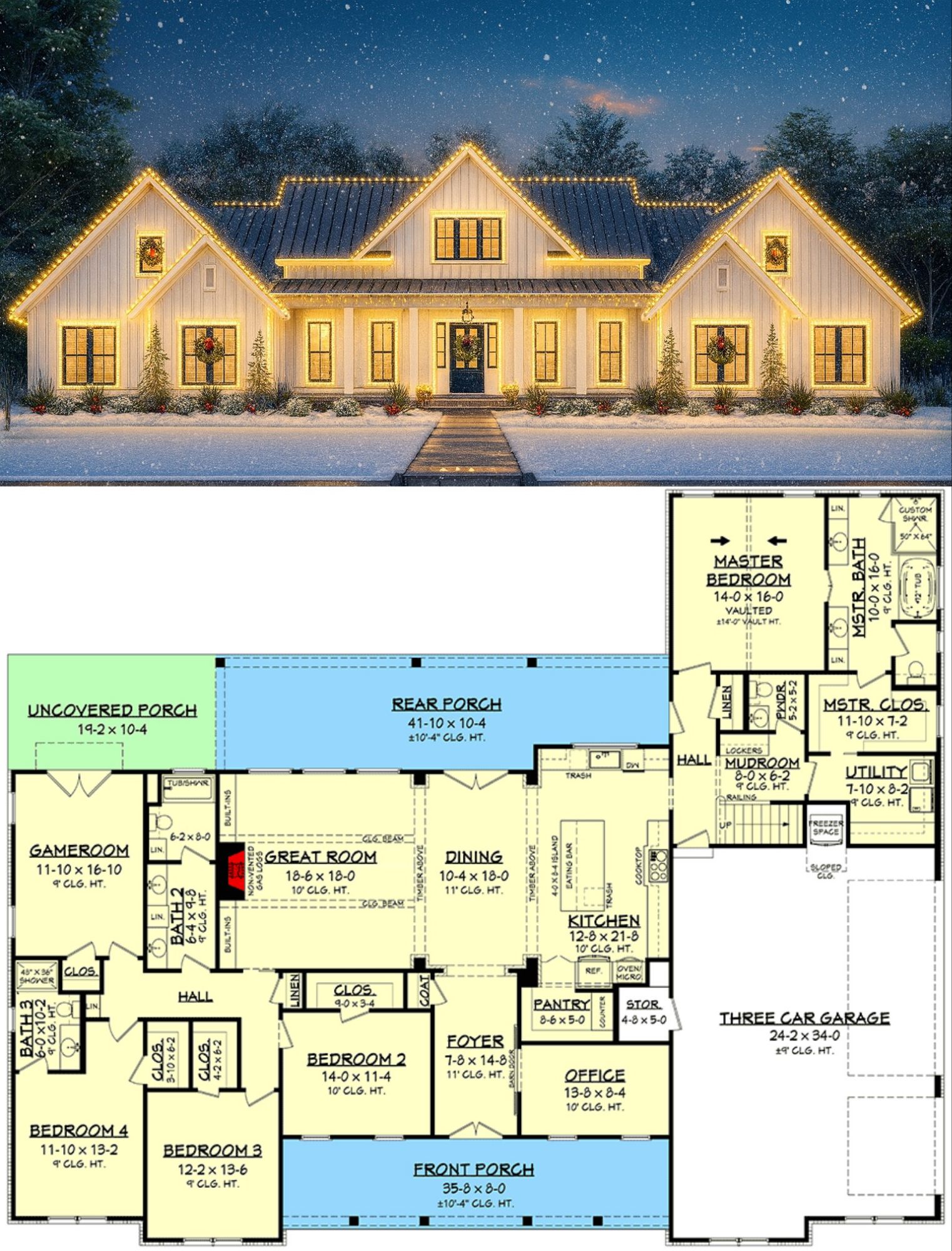This modern farmhouse design delivers approximately 3,086 sq ft of heated living space, with a flexible layout that supports 4 bedrooms, 3.5–4.5 bathrooms, plus a versatile game room and an optional bonus room over the garage.
