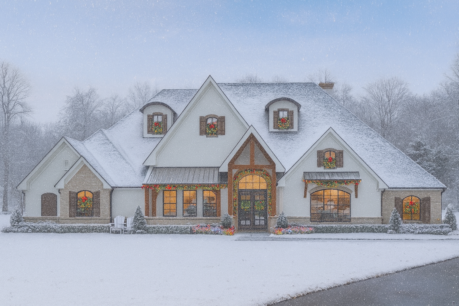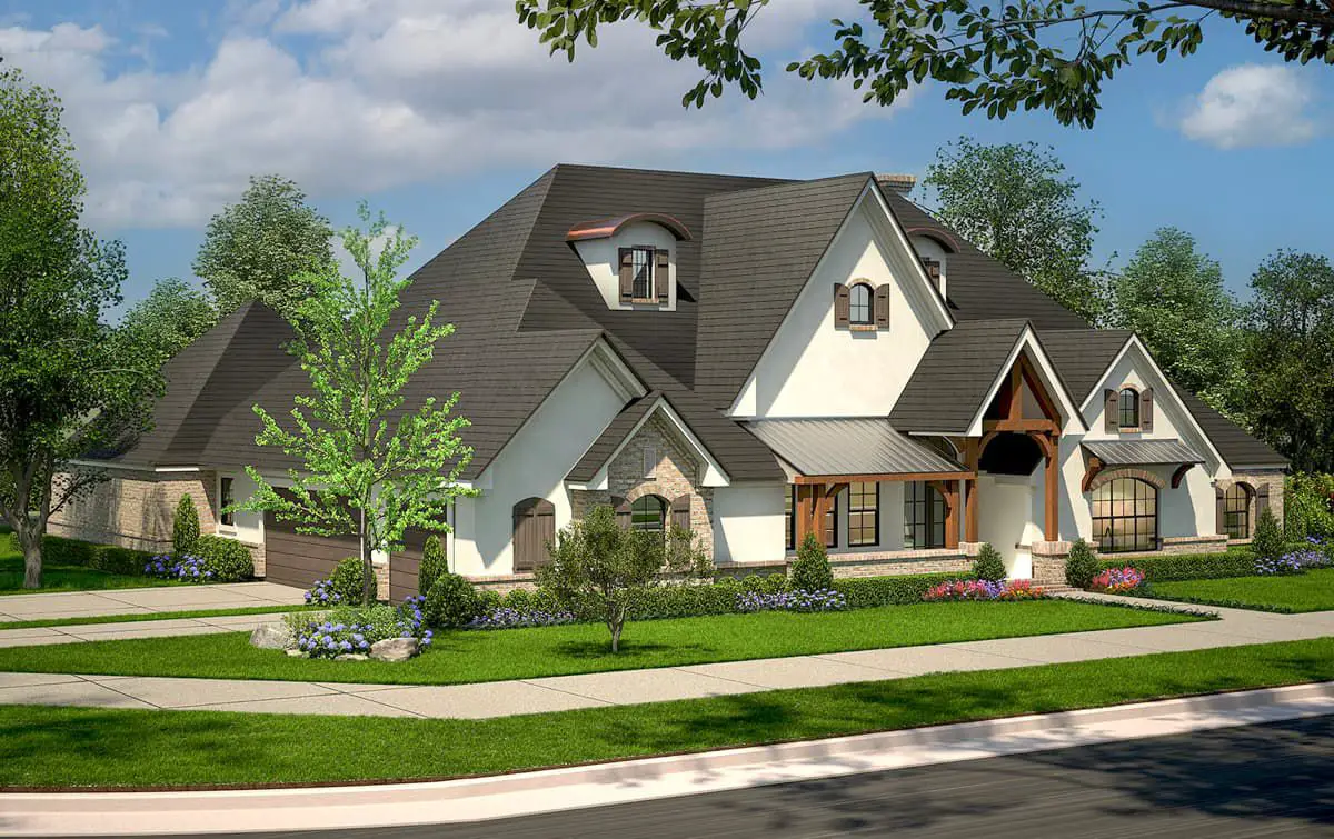The architecture feels solid and welcoming, designed to sit naturally on larger lots or scenic properties. Covered entry areas soften the scale and provide shade, while thoughtful rooflines add visual depth without feeling busy.