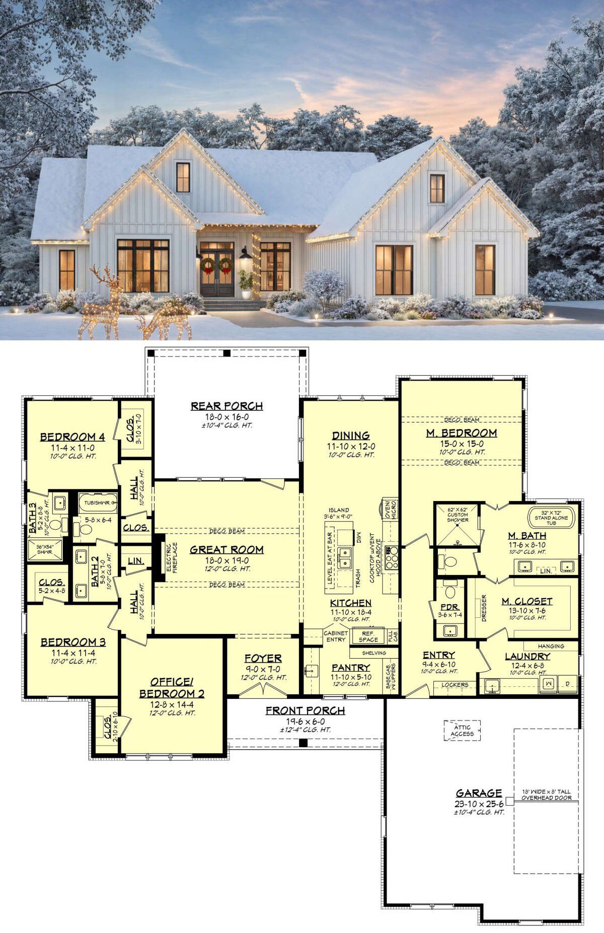 This modern farmhouse design offers approximately **2,475 sq ft** of comfortable, well-planned living space arranged in a smart single-story layout. With **4 bedrooms**, **3 full bathrooms**, and **1 half bath**, the home is sized just right for families who want openness without wasted space.