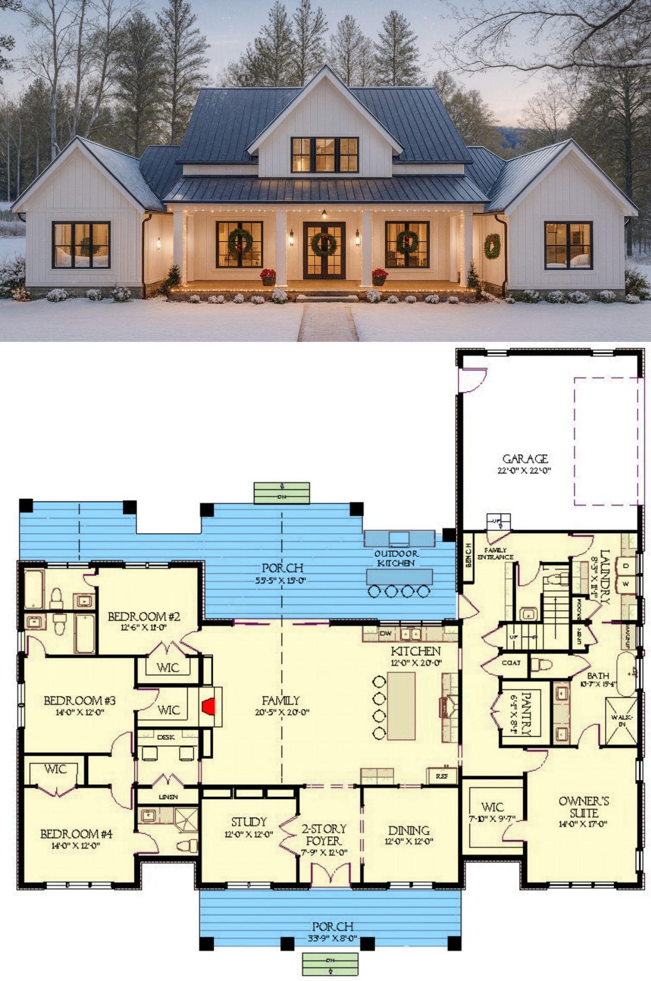 This modern farmhouse succeeds because it blends everyday comfort with lifestyle-driven features. The open interior keeps family life connected, while the bedroom layout protects privacy. The outdoor kitchen elevates entertaining without complicating the floor plan, and the single-level design makes the home accessible and future-friendly.