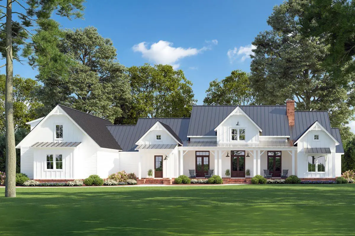 Outdoor living plays an important role in this design. Covered porch areas create comfortable outdoor rooms that extend the living space beyond the walls of the house. These areas are perfect for morning coffee, evening conversations, or casual outdoor meals.