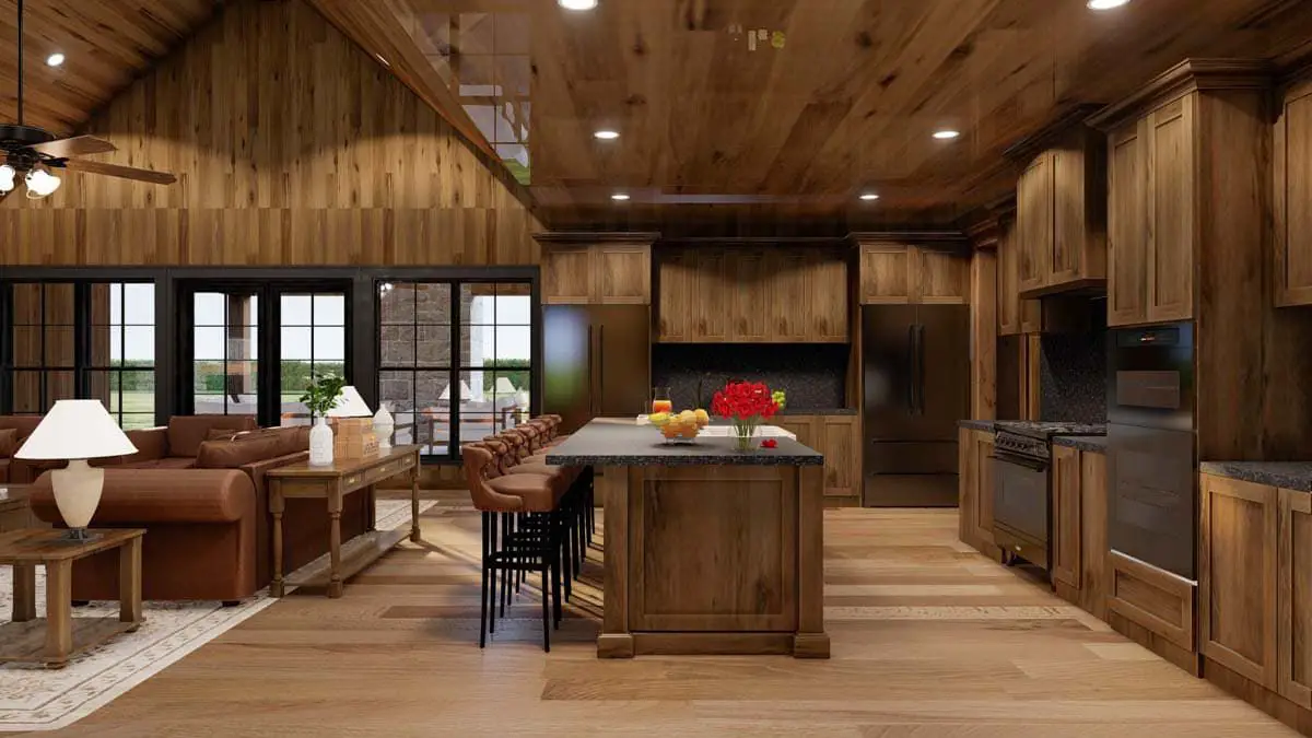 Large windows throughout the main living space help bring in natural light, accentuating the barndominium’s characteristic openness and tying the interior visually to outdoor area.