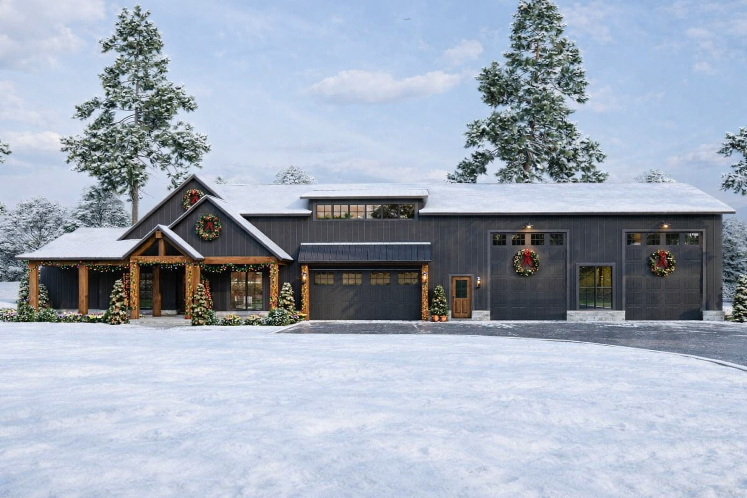 This home’s façade reflects contemporary rustic appeal with a streamlined barn-style profile, balanced vertical siding, and warm structural accents.