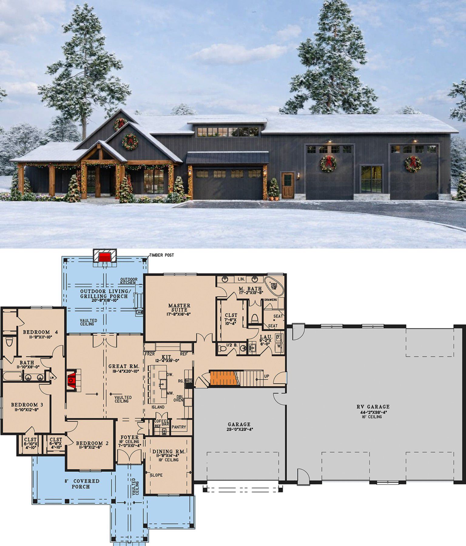 This barndominium-style home blends **open, modern living spaces** with **practical storage and workshop zones** — highlighted by an oversized RV garage bay — and adds lifestyle-enhancing outdoor spaces like a fireplace patio. The four bedrooms and flexible shared areas support family comfort, guest stays, or adaptable living needs. Whether you’re hosting gatherings indoors or enjoying quiet evenings outdoors by the fireplace, this design offers a versatile and well-balanced layout that fits both everyday life and recreational pursuits.