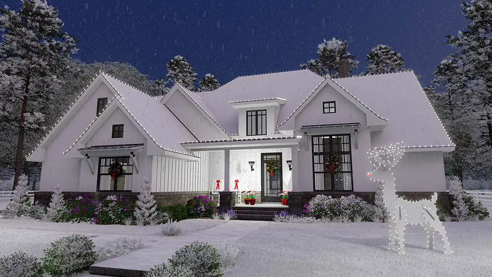 The exterior showcases timeless farmhouse character with balanced rooflines, clean siding lines, and welcoming covered porch spaces that enhance outdoor living and curb appeal.