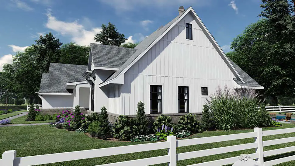 The home includes 4 bedrooms and 4 full bathrooms, along with an attached 2-car garage (~485 sq ft). With an open central living area, vaulted ceilings, generous covered porch space, and thoughtful details designed for everyday comfort and entertaining, this design blends classic farmhouse charm with modern flow and practical function.