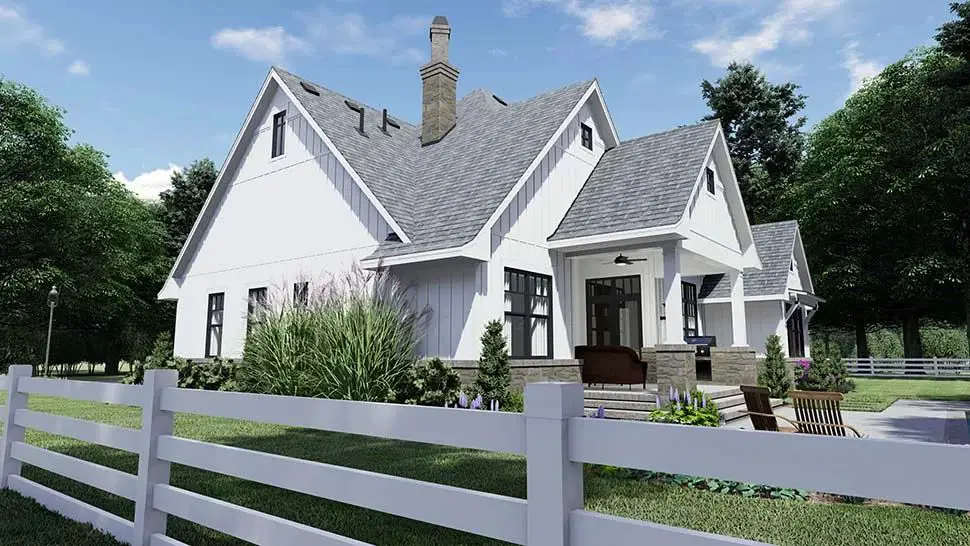 This farmhouse-inspired design thoughtfully blends **open shared living areas with flexible private zones and generous outdoor spaces**, making it ideal for everyday family routines as well as entertaining. Its vaulted central living area enhances light and flow, while the bonus room and covered outdoor spaces provide adaptable zones for recreation, guests, and relaxed indoor-outdoor living. The combination of functional layout and classic farmhouse elements creates a practical, comfortable home that suits a variety of lifestyles.