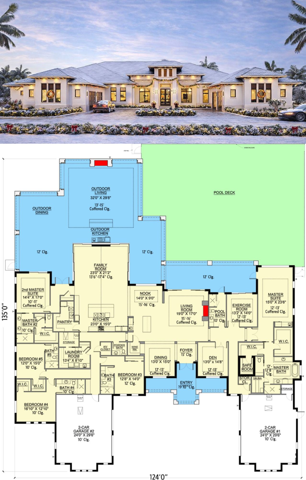 This luxury Mediterranean home plan delivers about 6,240 sq ft of expansive, thoughtfully designed single-story living space where indoor and outdoor lifestyles blend seamlessly. The layout includes 5 bedrooms and 6 full bathrooms + 1 half bath, plus an attached 4-car courtyard garage (~1,611 sq ft).