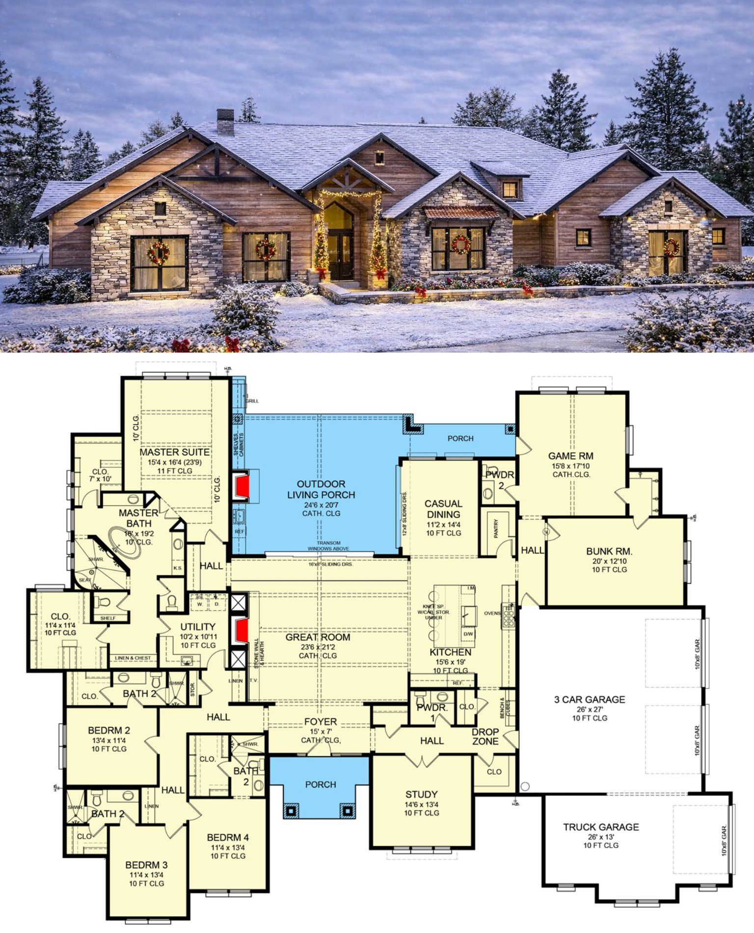 Designed around a vaulted and beamed great room, generous outdoor living porch, and flexible interior spaces like a vaulted game room and bunk room, this plan pairs mountain-inspired character with everyday comfort and entertaining potential.